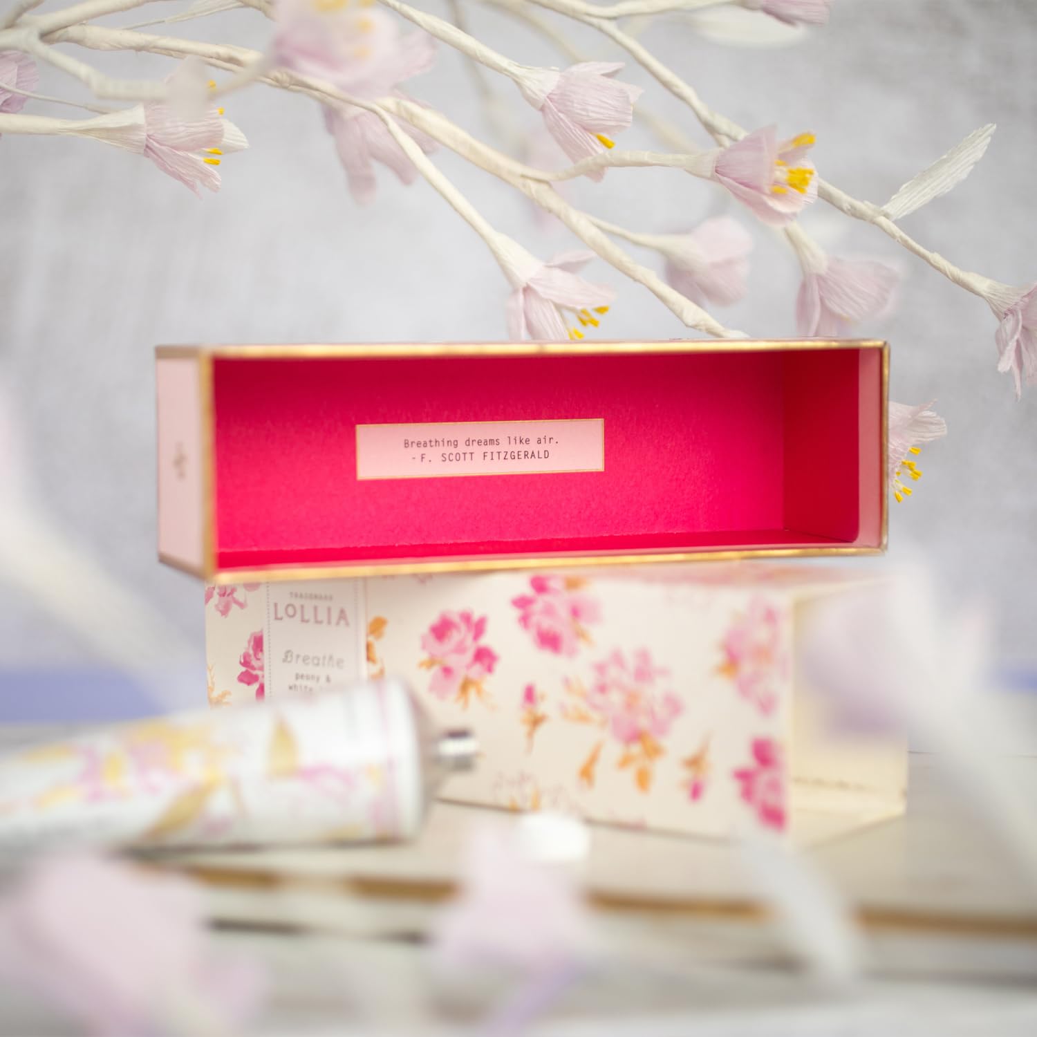 - FLORAL PEONY & WHITE LILY: Lollia Breathe Handcreme helps soothe and lightly moisturize the skin for beneficial hydration. Delicate infusions of peony and white lily leave the skin deliciously fresh and delightfully fragranced