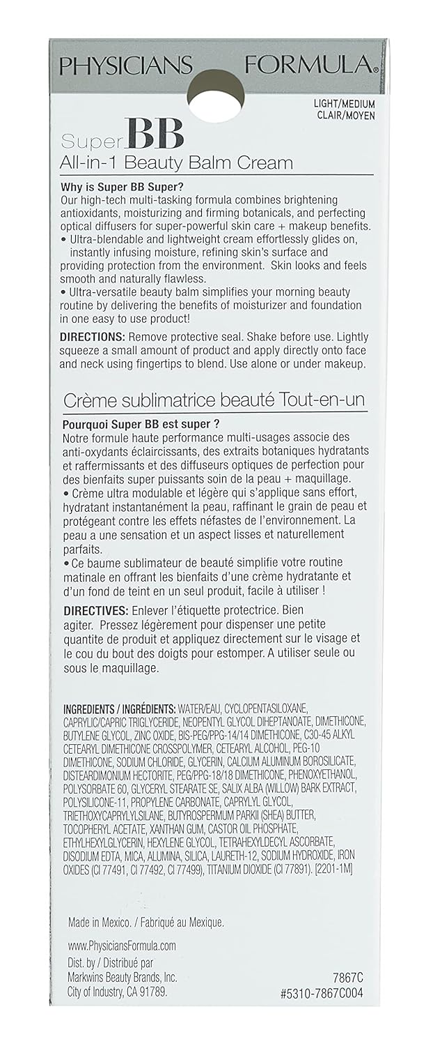 Physicians Formula Super BB All-in-1 Beauty Balm Cream Light/Medium | Dermatologist Tested, Clinicially Tested