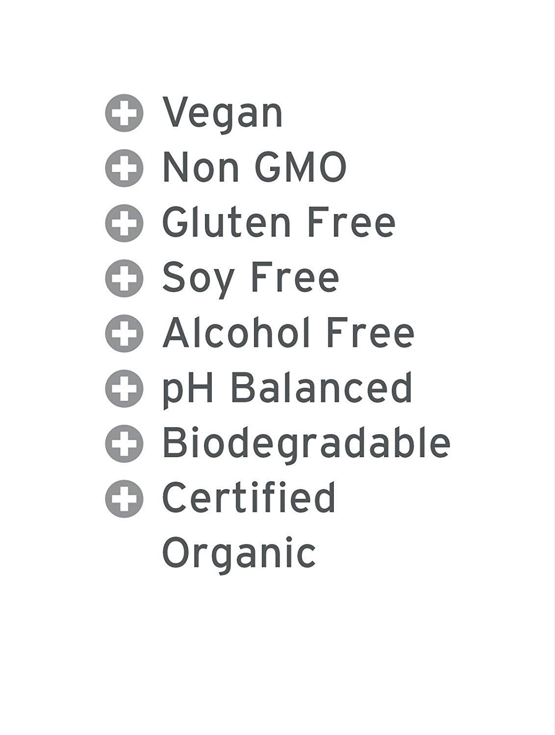 - Alcohol Free, Biodegradable, Certified Organic, Gluten Free, Non GMO, pH Balanced, Soy Free, Vegan