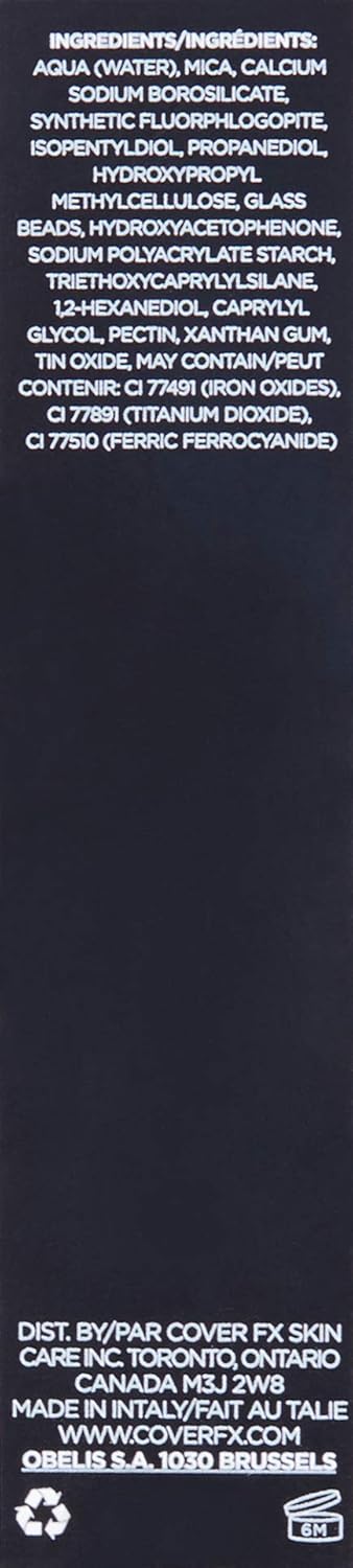 - Ingredients: Water/Aqua/Eau, Mica, Calcium Sodium Borosilicate, Synthetic Fluorphlogopite, Isopentyldiol, Propanediol, Hydroxypropyl Methylcellulose, Glass Beads, Hydroxyacetophenone, Sodium Polyacrylate Starch, Triethoxycaprylylsilane, 1,2-Hexanediol, Caprylyl Glycol, Pectin, Xanthan Gum, Tin Oxide, May Contain: CI 77491 (Iron Oxides), CI 77891 (Titanium Dioxide), CI 77510 (Ferric Ferrocyanide)