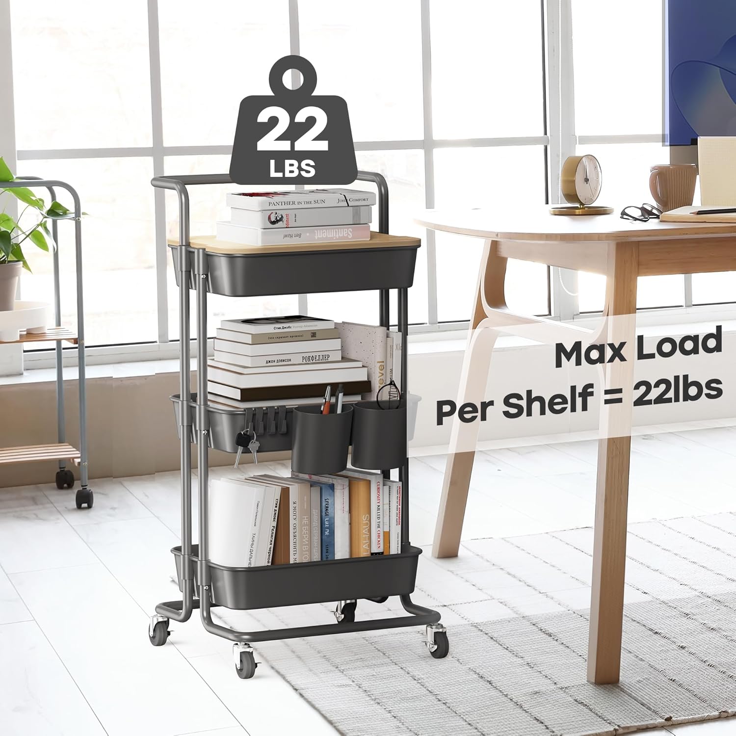 - Ultimate Storage Solution: The DTK storage cart offers 3 basket/ shelves, 3 cups and 6 hooks for storage. Also it comes with a lid table top so you can cover the basket for clean reason or you can place daily items like lap top, coffee cup on it.