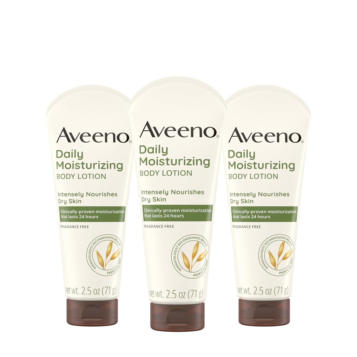Aveeno Daily Moisturizing Body Lotion, Gentle Lotion Nourishes Dry Skin With Moisture, Soothing Prebiotic Oat, Fragrance-Free, Non-Comedogenic, Travel-Size, Pack of Three, 3 x 2.5 fl. Oz