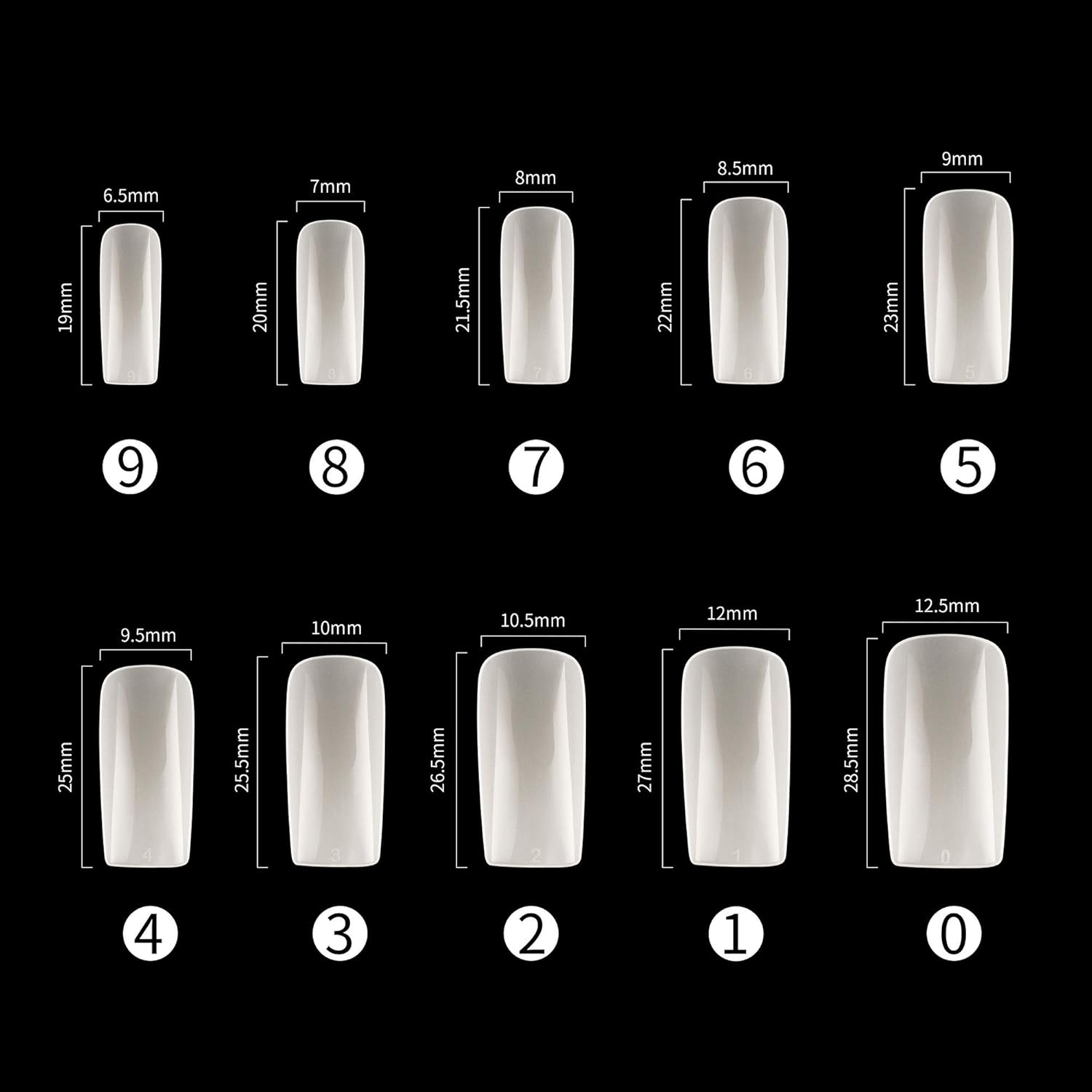 - Full-covered false nail tips, 500pcs nail tips, 10 different sizes, stored in numbered case with 10 small grid.
