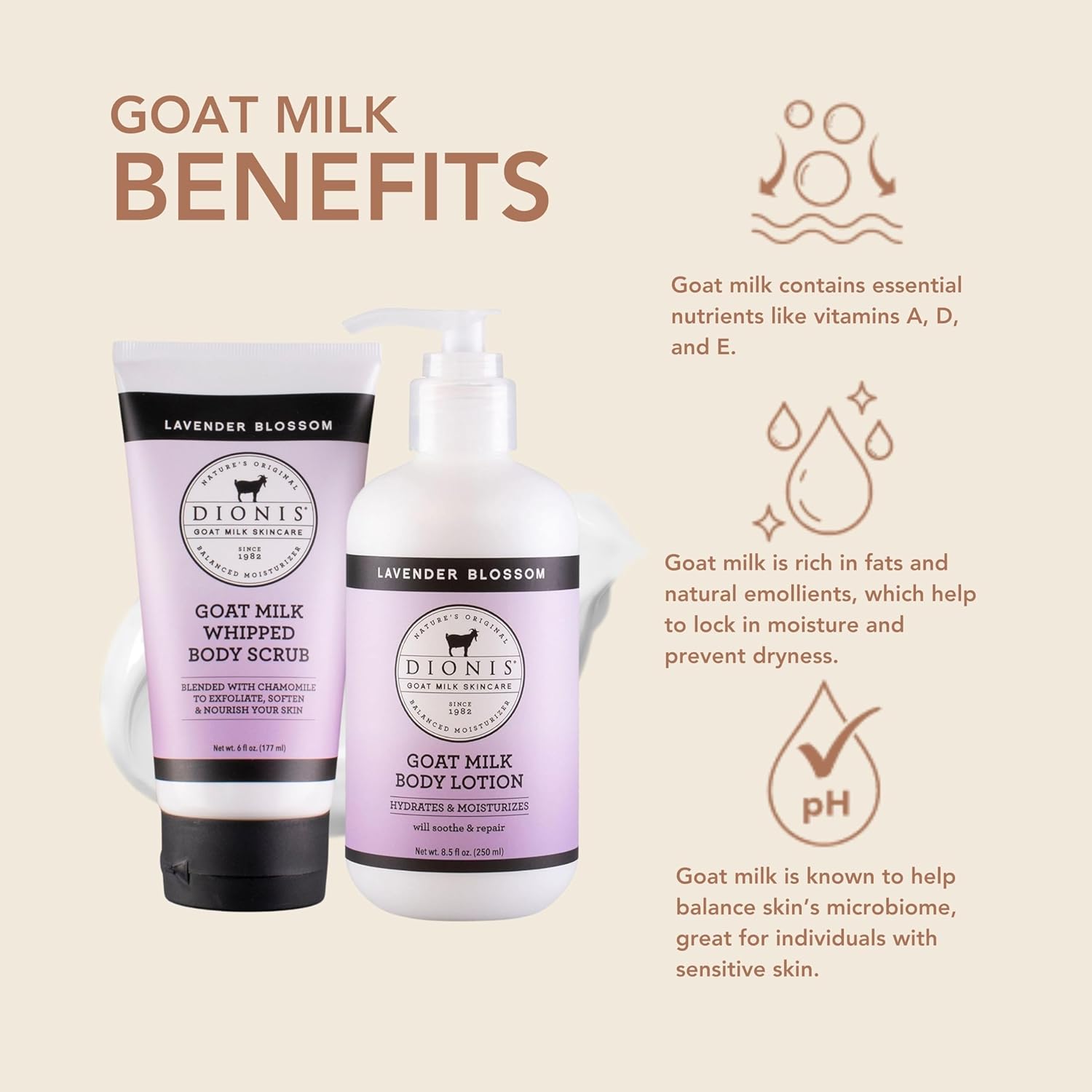 - Skin's Best Friend - The Dionis goat Milk Skincare Lotion is rich and creamy. With regular use itβs designed to ease rough skin, making it smooth and silky. It also does not leave a greasy residue like many lotions, so you can apply it right before putting on your favorite sweater.