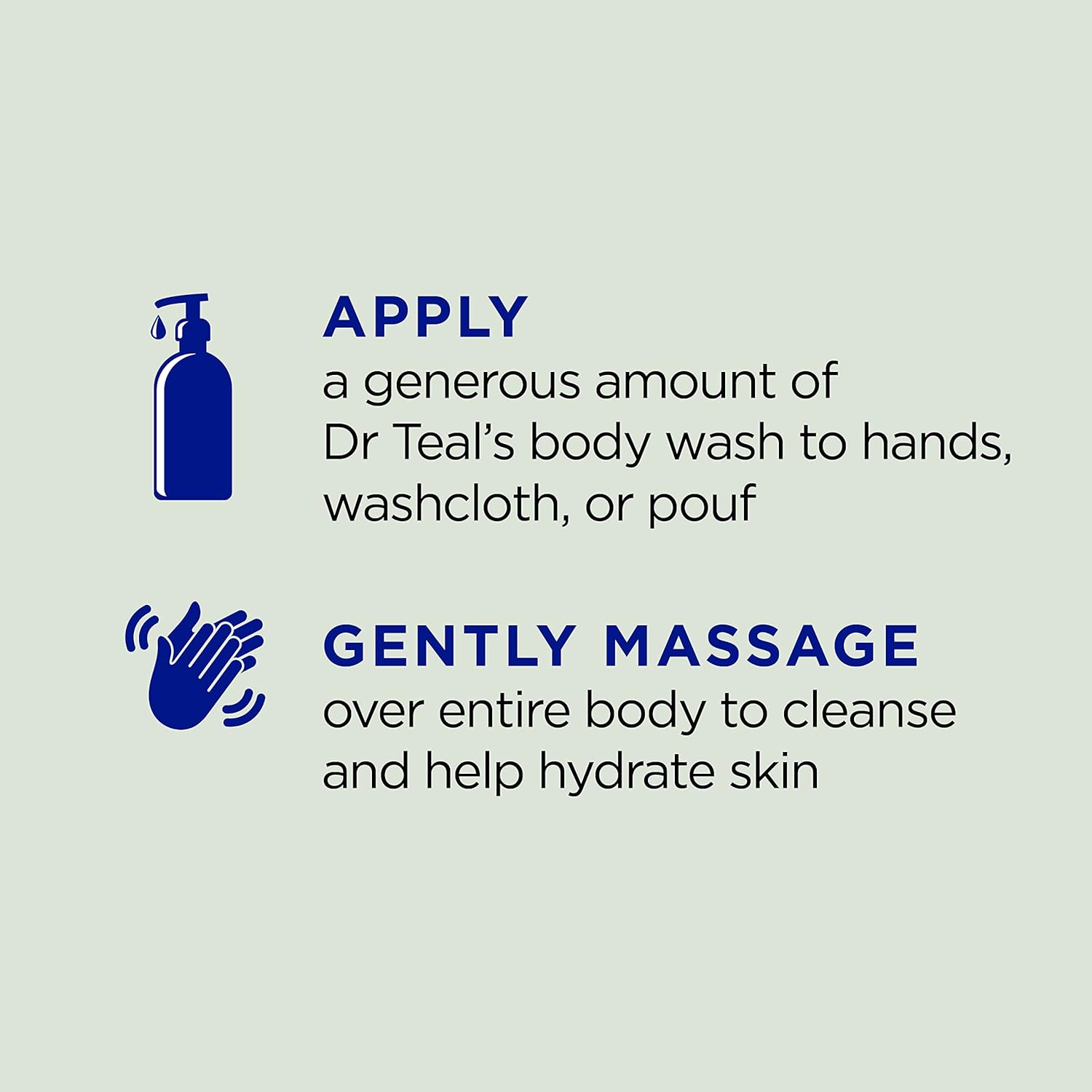- Apply a generous amount of Dr Tealβs body wash to hands, washcloth, or pouf, then gently massage all your body for ultra-moisture and total rejuvenation.