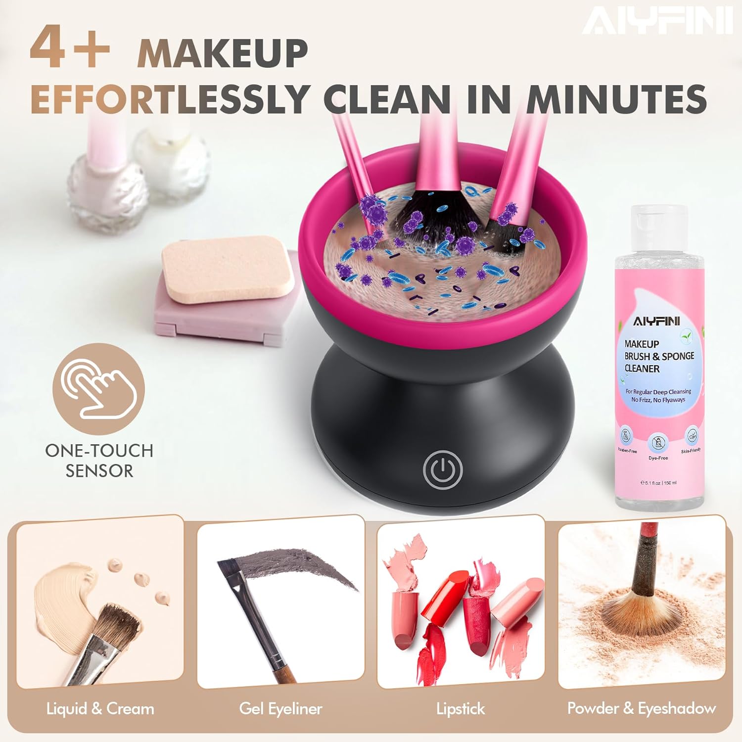 Alyfini Electric Makeup Brush Cleaner Machine, Powerful Friction Removes Residue on Make up Brushes Set/Sponge/Powder Puffs, Efficient Cleaning, Portable Spinning Washer, Save Cleanser & Shampoo
