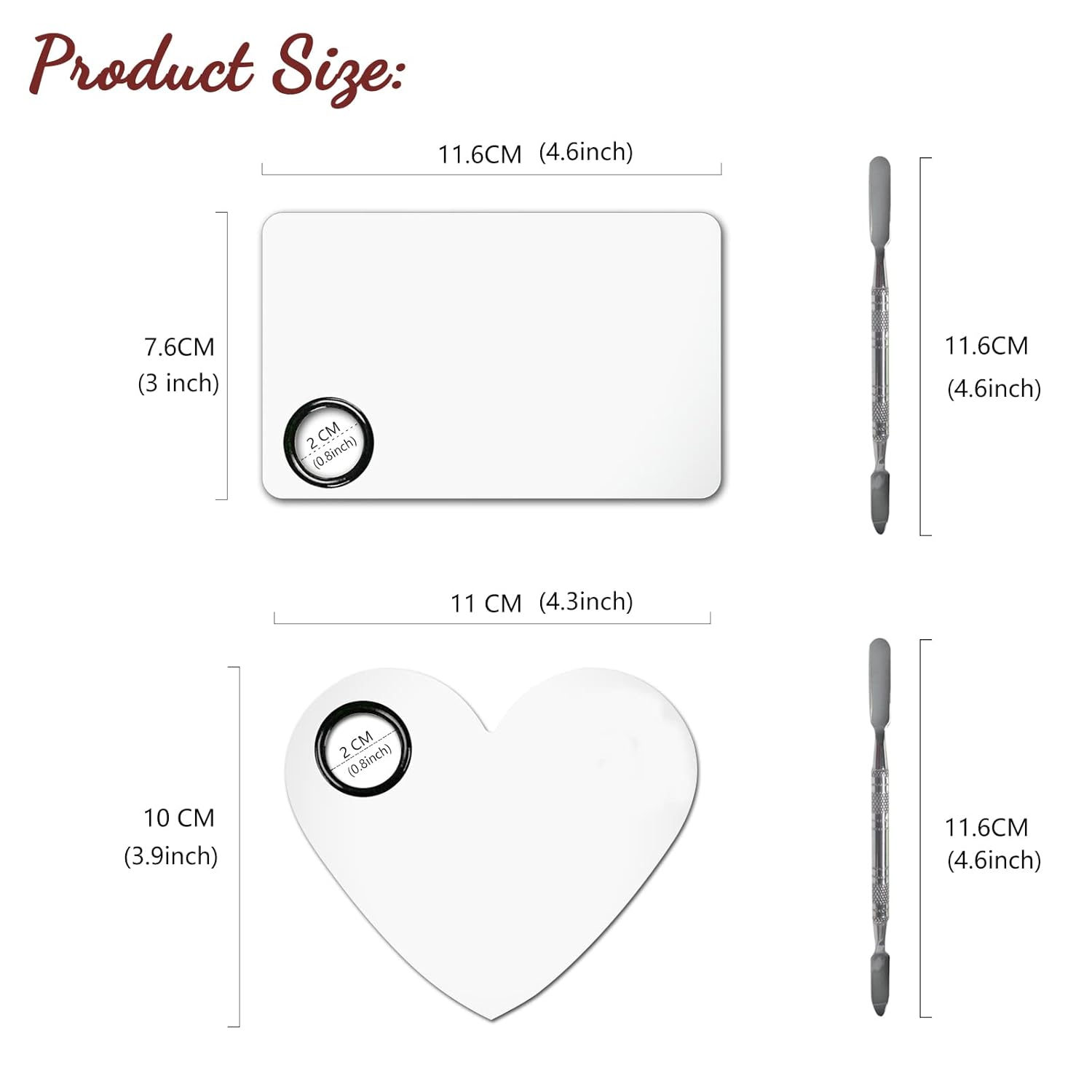 - 2.γPackage Contentsγ: 2Pcs Makeup Palettes & 2Pcs Spatulas. 1rectangular palette (length x width: 4.6*3in) + 1 heart-shaped makeup palette (length x width: 4.3*3.9in) +2 spatulas (length: 4.6in), Small and light.