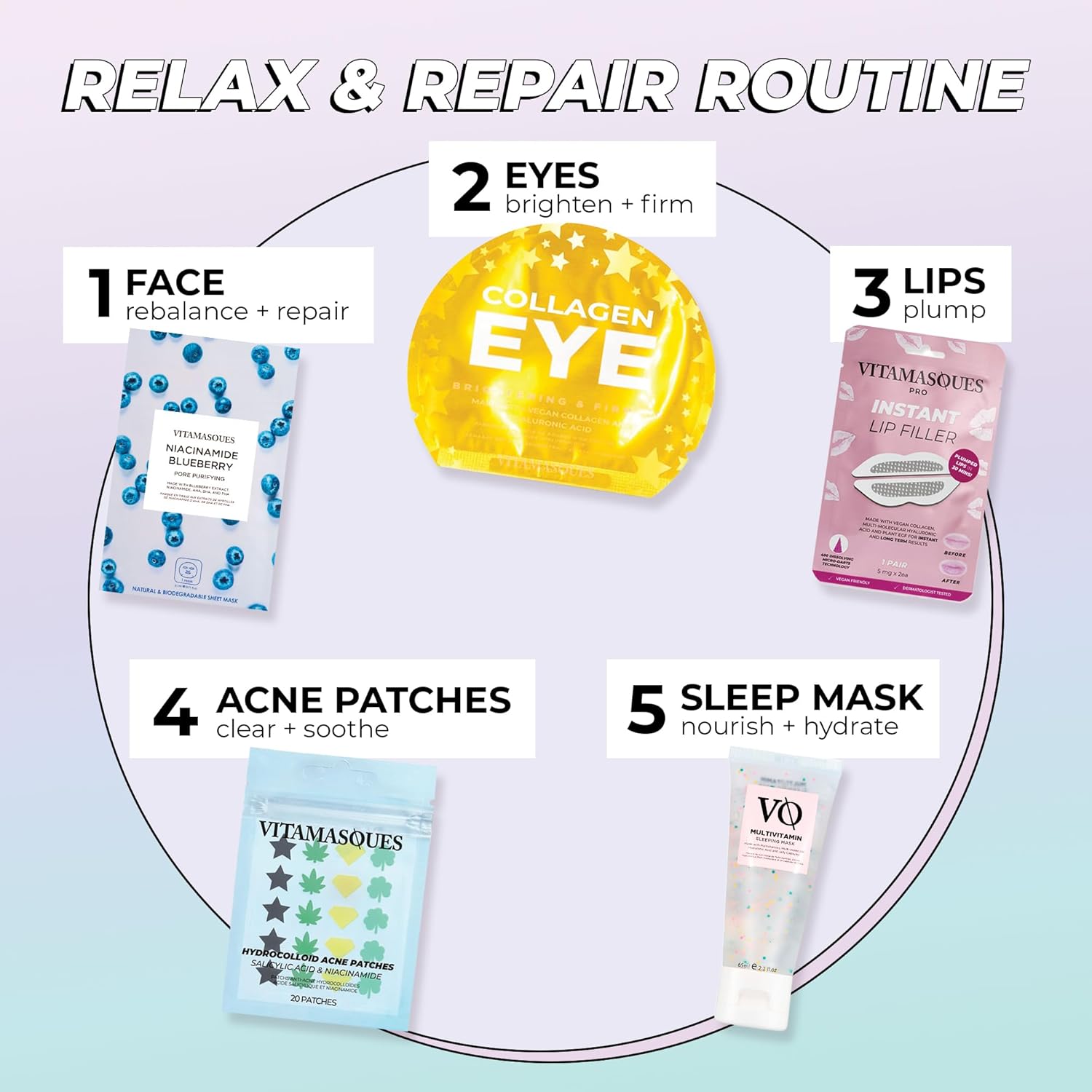 - Eye Pads: Vitamasques Vegan Collagen Eye Pads are a vegan-friendly pair of eye pads with brightening and firming effects and skin-gel technology for a contour-hugging fit. Includes 3 individually packaged pairs of eye pads.