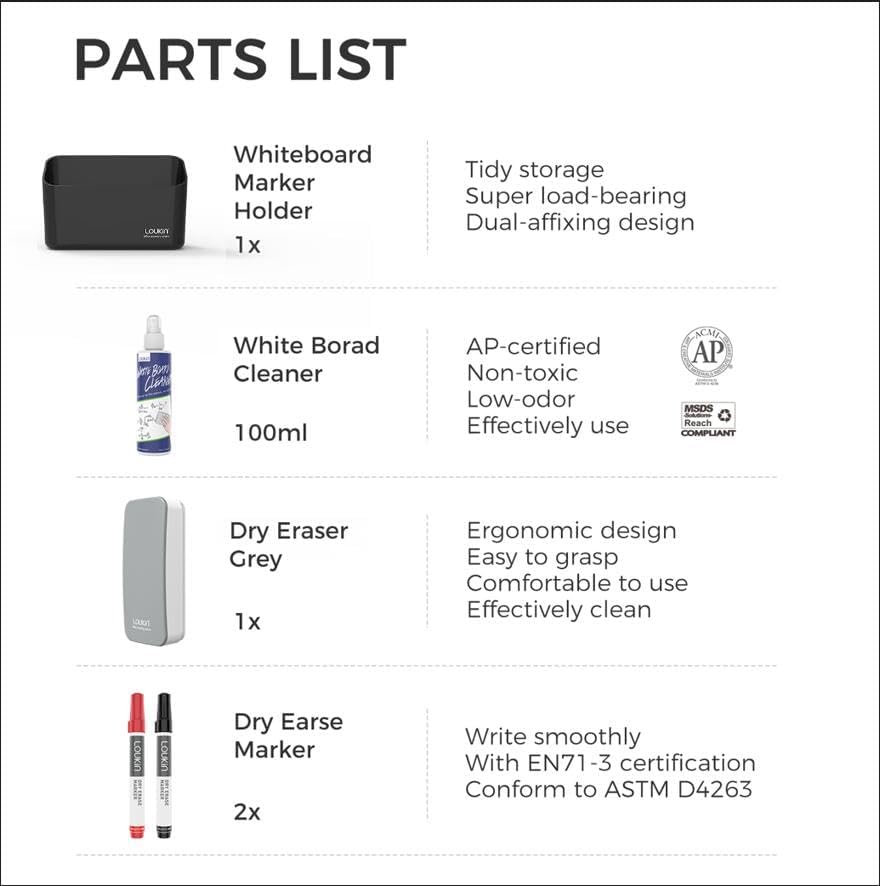 - CONTAINS: 1 marker holder(5.12 x 1.97 x 3.54 in) ; 1Dry eraser grey; 2 dry erase markers with En713 certification; 3.4 oz cleaner with AP certificationοΌ2x longlasting adhesive, 2x strong magnet.
