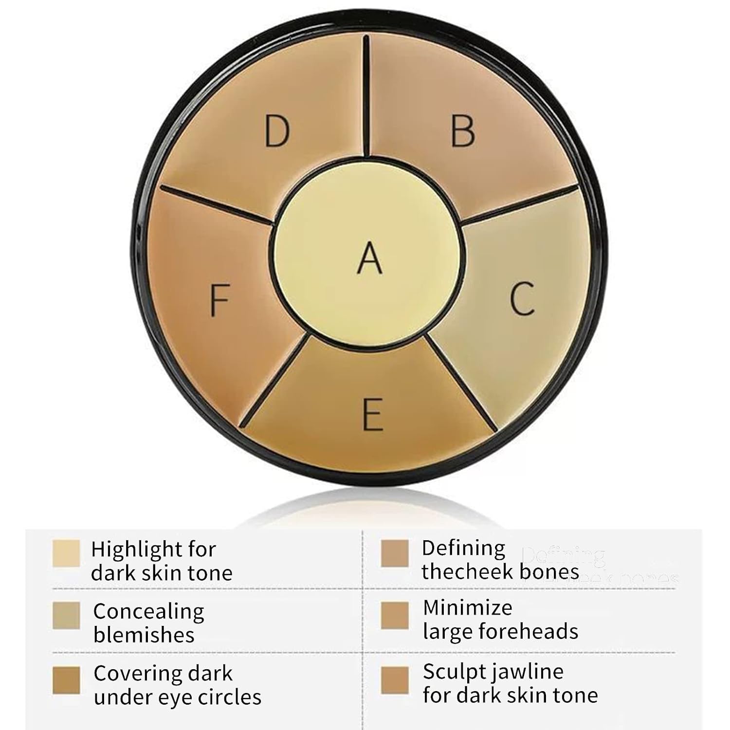 - Correct and Conceal: Our palette helps conceal trouble spots and visibly correct discolorations; Light and medium camouflage imperfections, yellow and peach conceal dullness and dark circles, green covers redness, purple and pink brighten