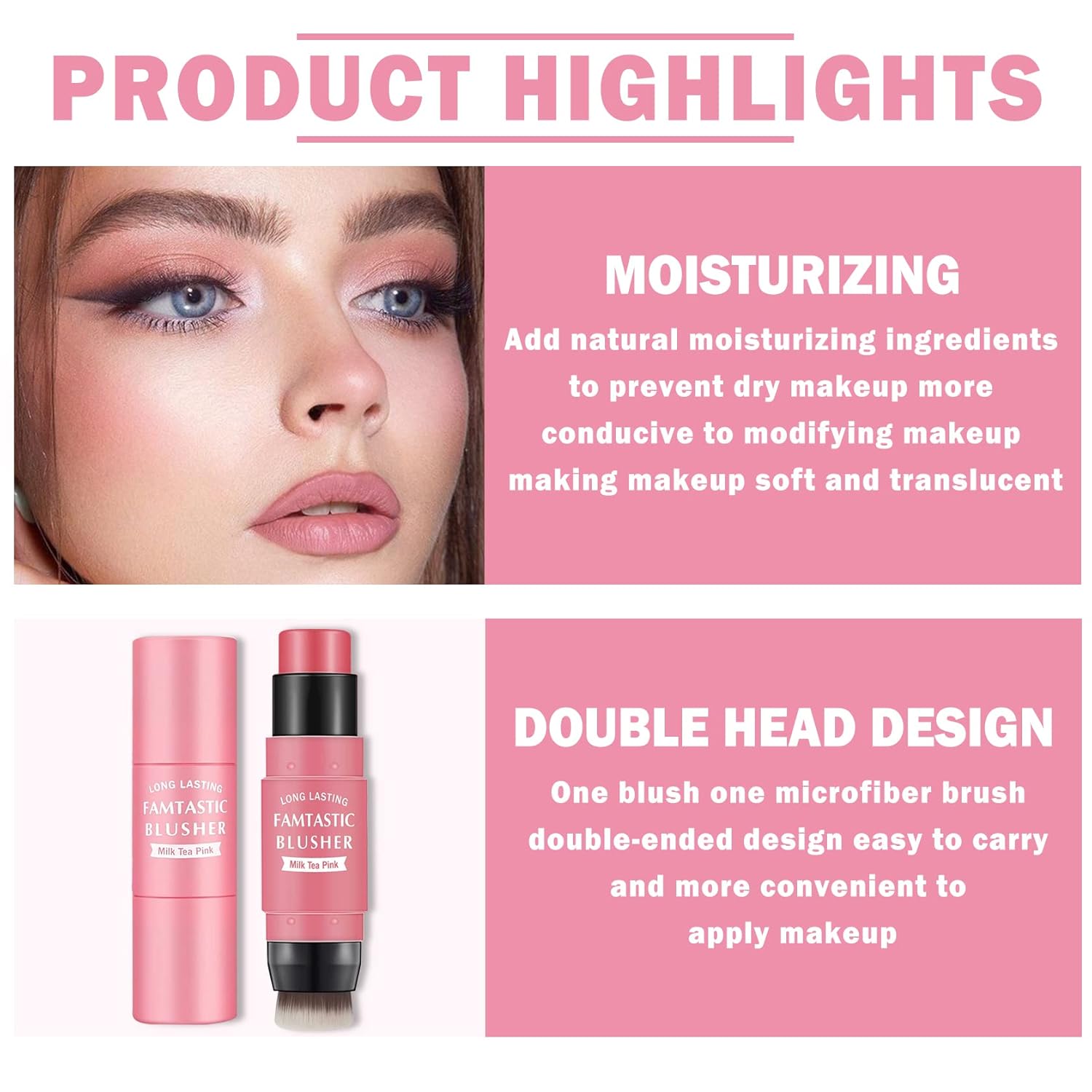 - 【Multi-Purpose Makeup Stick】Cream blush has a dual-ended design with a cream blush tip on one end and a microfiber contour brush on the other end, the easy-applying, blendable and breathable blush stick provides a glamorous finish to cheeks, eyes and lips , to meet all your requirements.