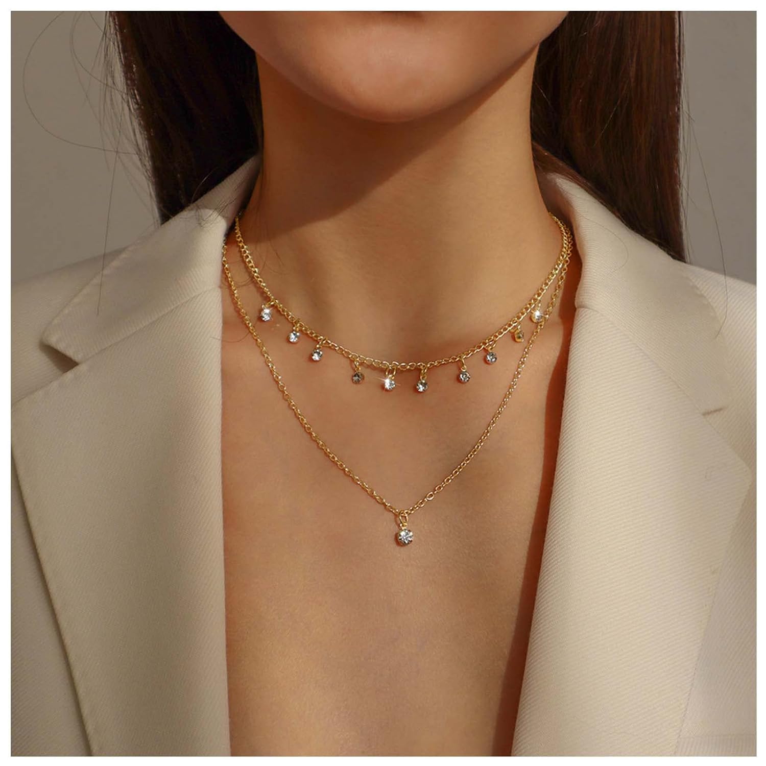 Boho Layered Gold Choker Necklace Crystal Pendant Necklace Rhinestone Tassel Choker Necklace Sparkly CZ Dangle Necklace Chain Jewelry for Women and Girls (Gold)