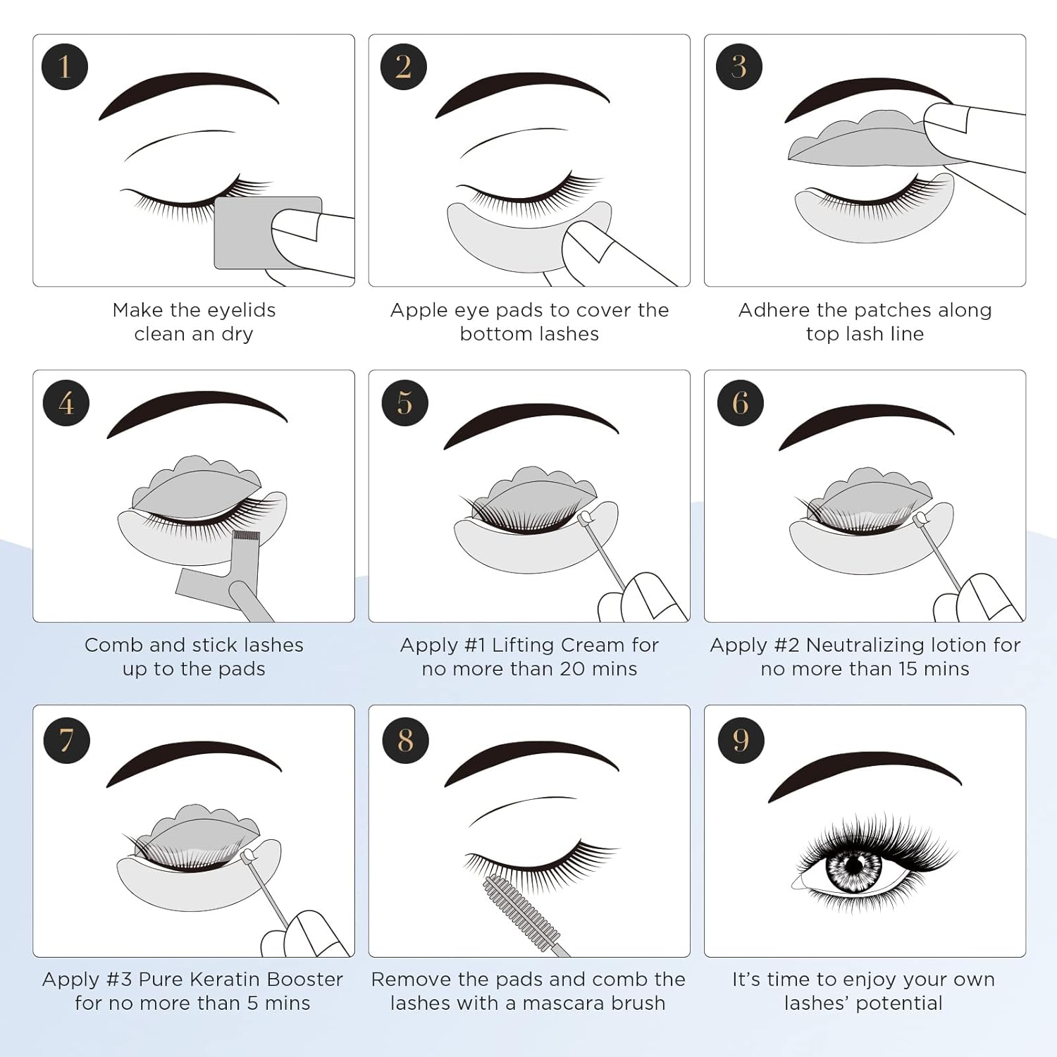 - 【ENOUGH FOR 5 APPLICATIONS】Lifting Cream *5pcs, Neutralizing Lotion *5pcs, Keratin Booster *5pcs, Lash Shields (S/M/L) *6pairs, 3-In-1 Wand *1pcs, 3D Eye Pads *5Pouches , Micro Brushes *25pcs, Mascara Brushes *15pcs, Ring Cups *50pcs