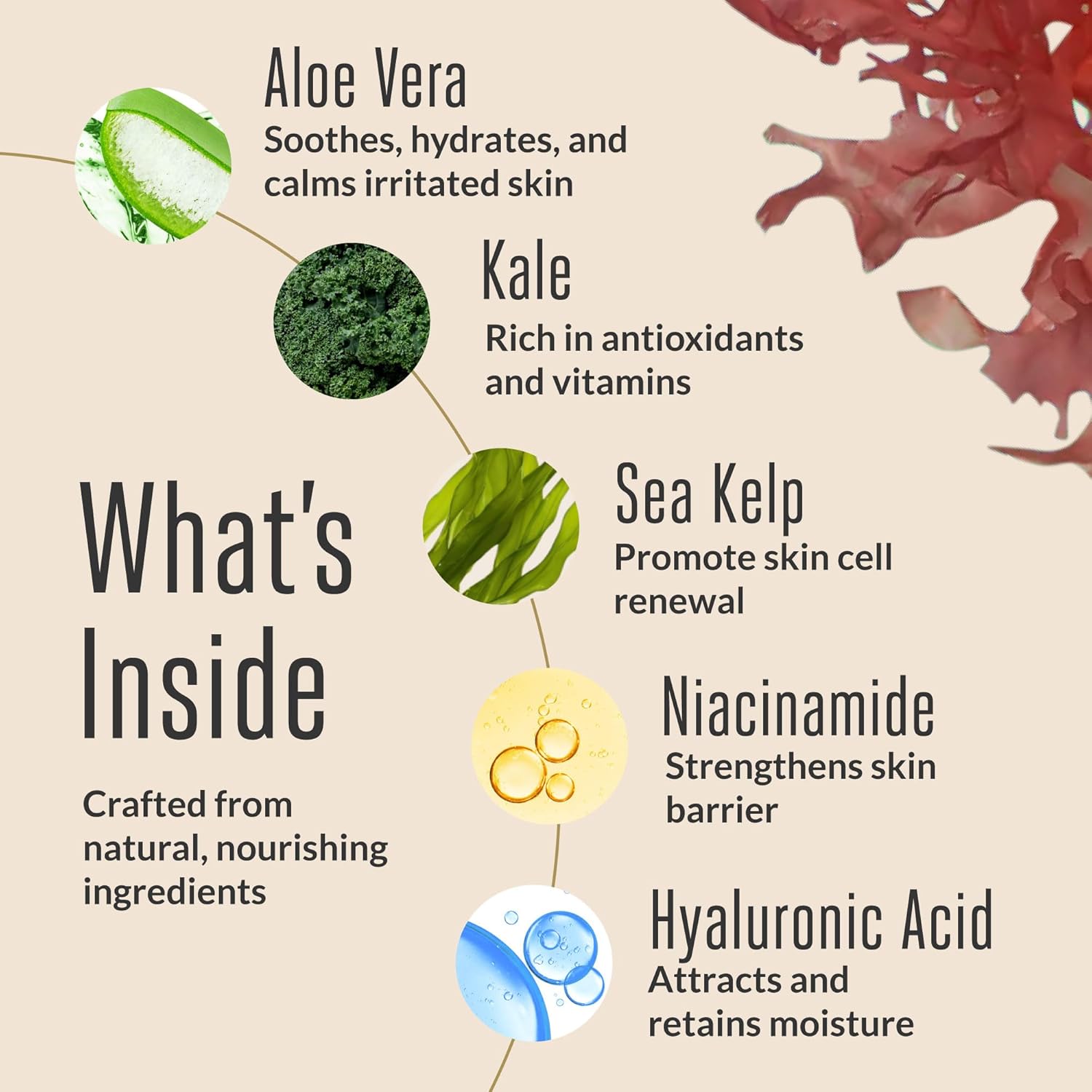 - GENTLE FORMULA: Our eye firming cream is made of clean ingredients such as Aloe, Kale, Sea Kelp, Niacinamide, and Hyaluronic Acid. Free from parabens, sulfates, and artificial fragrances, our skin care ensures a gentle, nourishing experience.