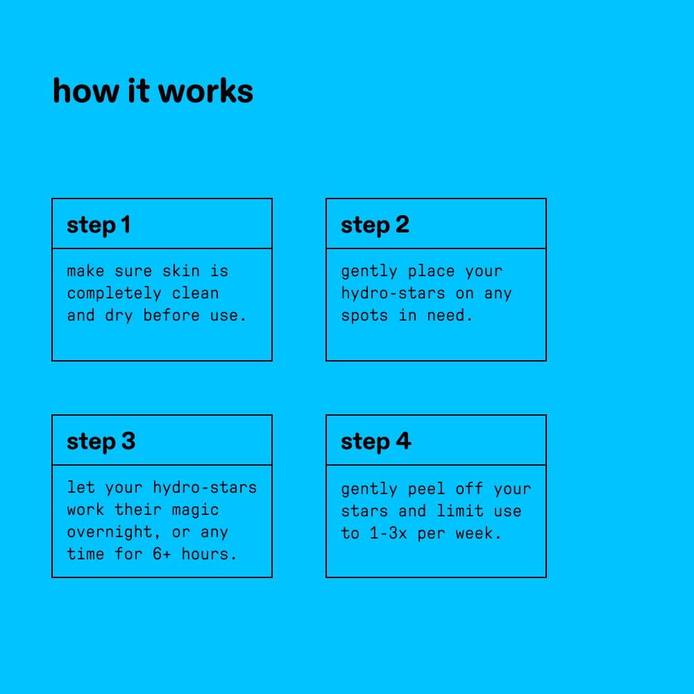 - EASY TO USE: Apply to clean, dry skin (after cleansing + before moisturizing). Leave on overnight (or 6+ hours) and limit use to 1-3x per week. Use a classic Hydro-Star once your spot comes to a head.
