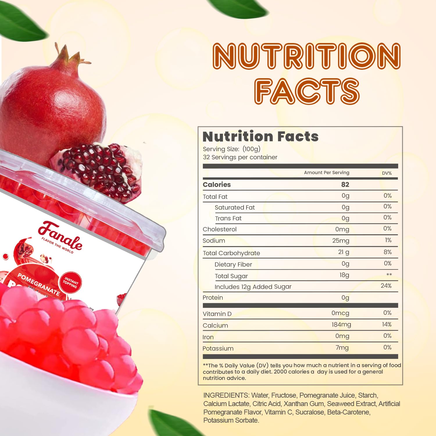 - 𝐄𝐧𝐫𝐢𝐜𝐡𝐞𝐝 𝐖𝐢𝐭𝐡 𝐉𝐮𝐢𝐜𝐲 𝐆𝐨𝐨𝐝𝐧𝐞𝐬𝐬: The fruit boba pearls are filled with natural and organic Pomegranate goodness. You get a juicy, mouthful taste of Pomegranate with every bite and slurp of your favorite beverages.
