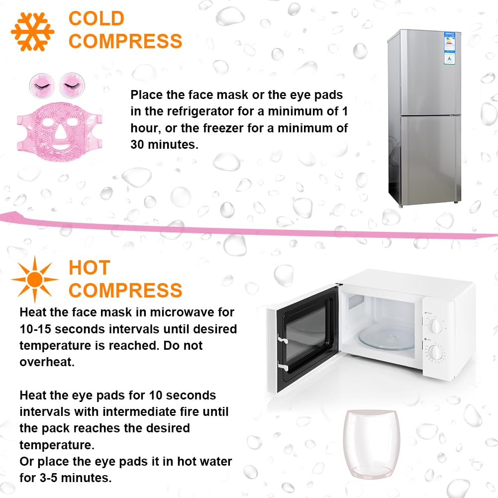 - γRemedy for Eye and FaceγFilled with Gel beads it can be used as a hot pack or a cold pack. A great remedy to reduce dry eyes, dry skin ,migraines. No more dark circles! Good for puffy eyes treatment. Use as a therapeutic aid for sleep improvement. Use to naturally shrink pores, calm acne prone skin, or for pore opening before a deep clean and makeup application. A essential product for beauty.Can also be used post wisdom teeth surgery, plastic surgery, for fever, shoulder, neck, back tension.