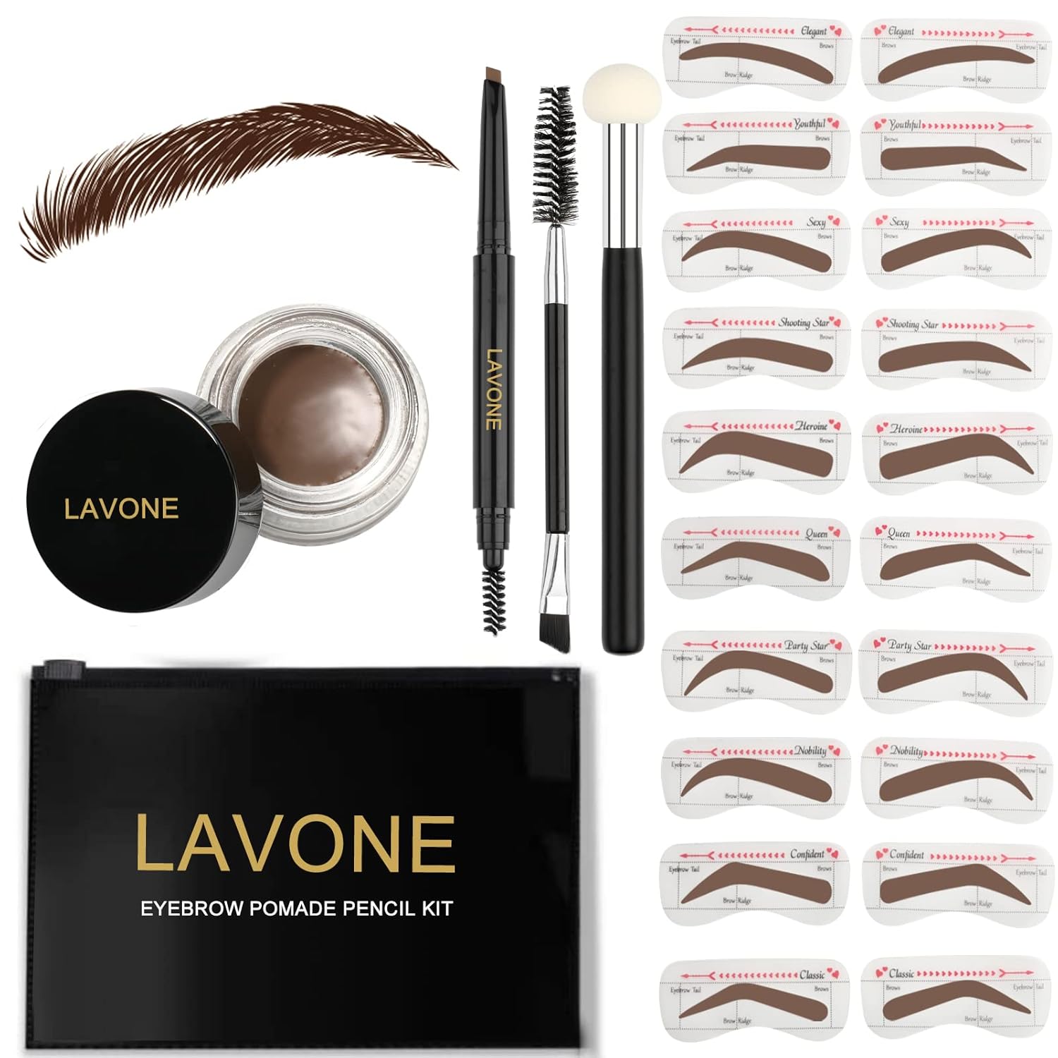 - [Whatβs in the eyebrow kit]: LAVONE makeup eyebrow kit includes brow pencil (dark brown), eyebrow powder(dark brown), 20 eyebrow stencils (10 different shapes), a sponge applicator, a dual precision brush and a zipper pouch for on the go.