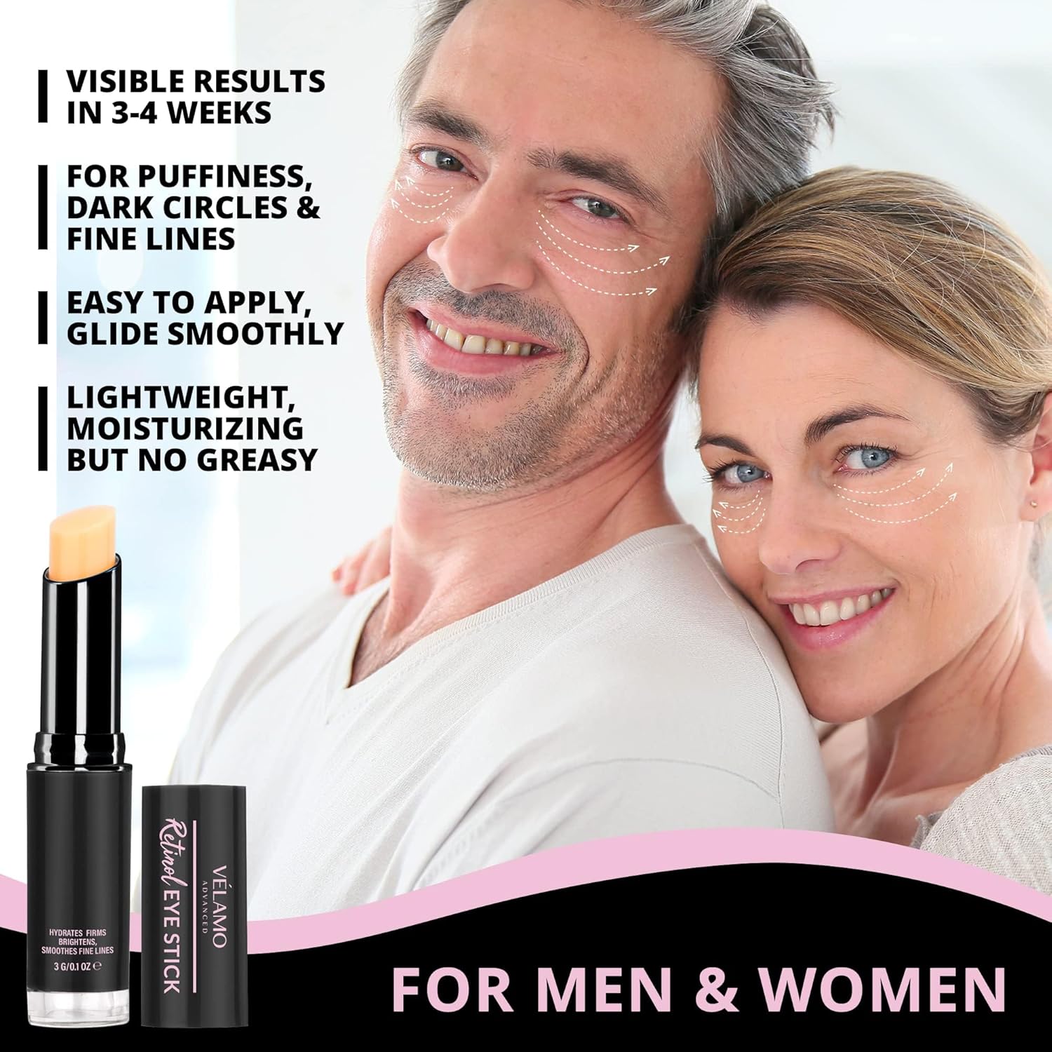 - ๐The Retinol Eye Cream for Dark Circles and Puffiness - VELAMO ADVANCED retinol eye stick is s a complete multi-treatment balm for younger-looking, brighter, and well-rested eyes. Our eye brightener stick works like a charm as under eye cream anti aging solution. This power-packed and do-it-all balm visibly boosts bounce and moisture levels. Most importantly, it is safe for sensitive skin.