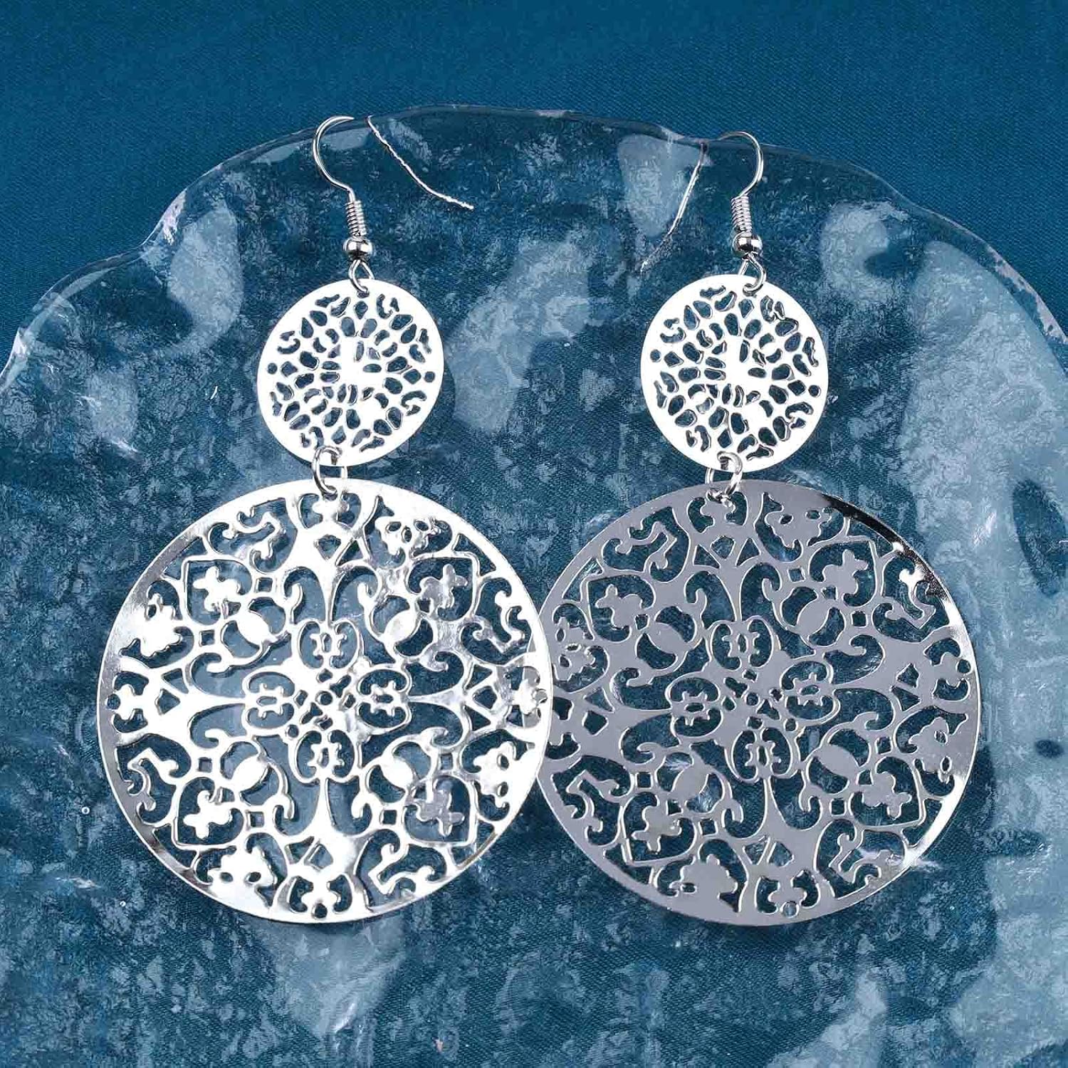 Filigree Hollow Disc Dangle Drop Earrings Boho Gold Ethnic Carved Flower Earrings Double Round Disc Drop Earrings Statement Hook Earrings Wedding Bridesmaid Jewelry for Women and Girls