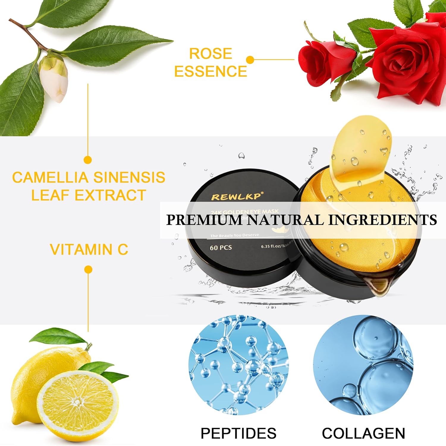 REWLKP 24k Gold Eye Collagen Patches - Puffy Eyes & Dark Circles Treatments,Reduce Under Eye Bags and Smooth Wrinkles,Eye Skin Care Pads With Collagen