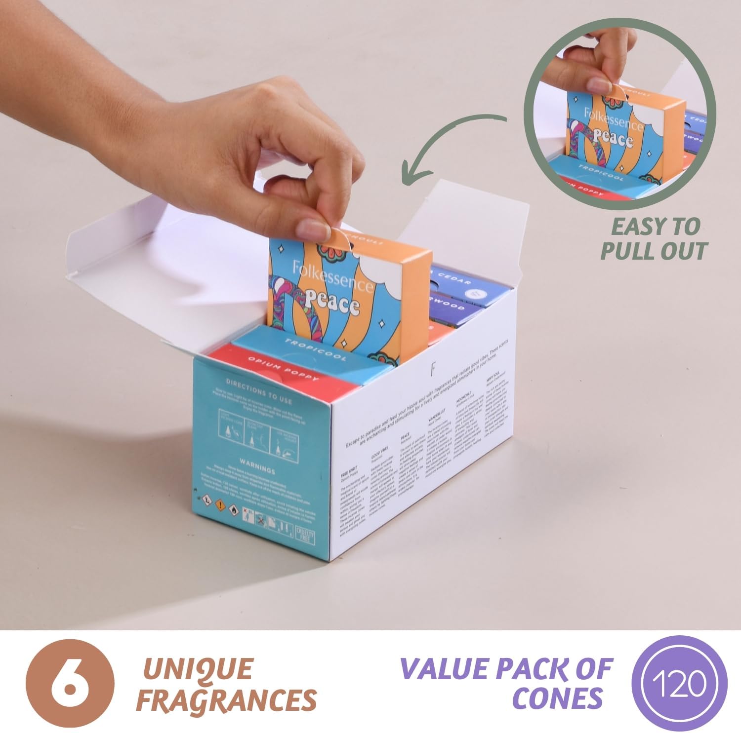 Folkulture Incense Cones Scented | Set of 6 Fragrances (120 Cones) with Incense Cones Holder | Opium Poppy Patchouli Incenses | Mango Pineapple, Balsam Cedarwood | Organic Variety Pack Inscents