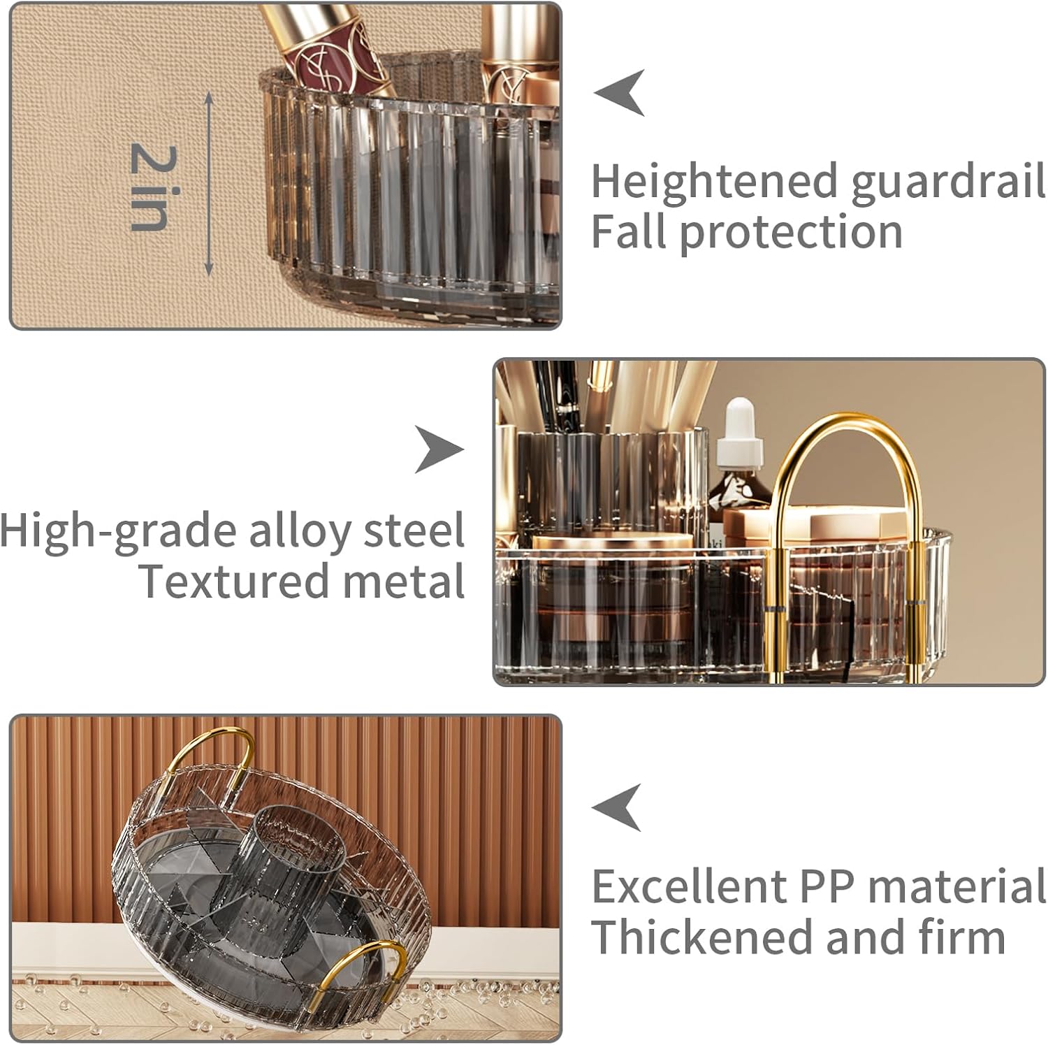 - 【360° Rotation】: The large-capacity makeup organizer allows you to store your cosmetics and skincare products in a clean and orderly space, 360° smooth rotation allows you to quickly find what you need, It's very convenient. The raised edges prevent cosmetics from falling off during rotation.