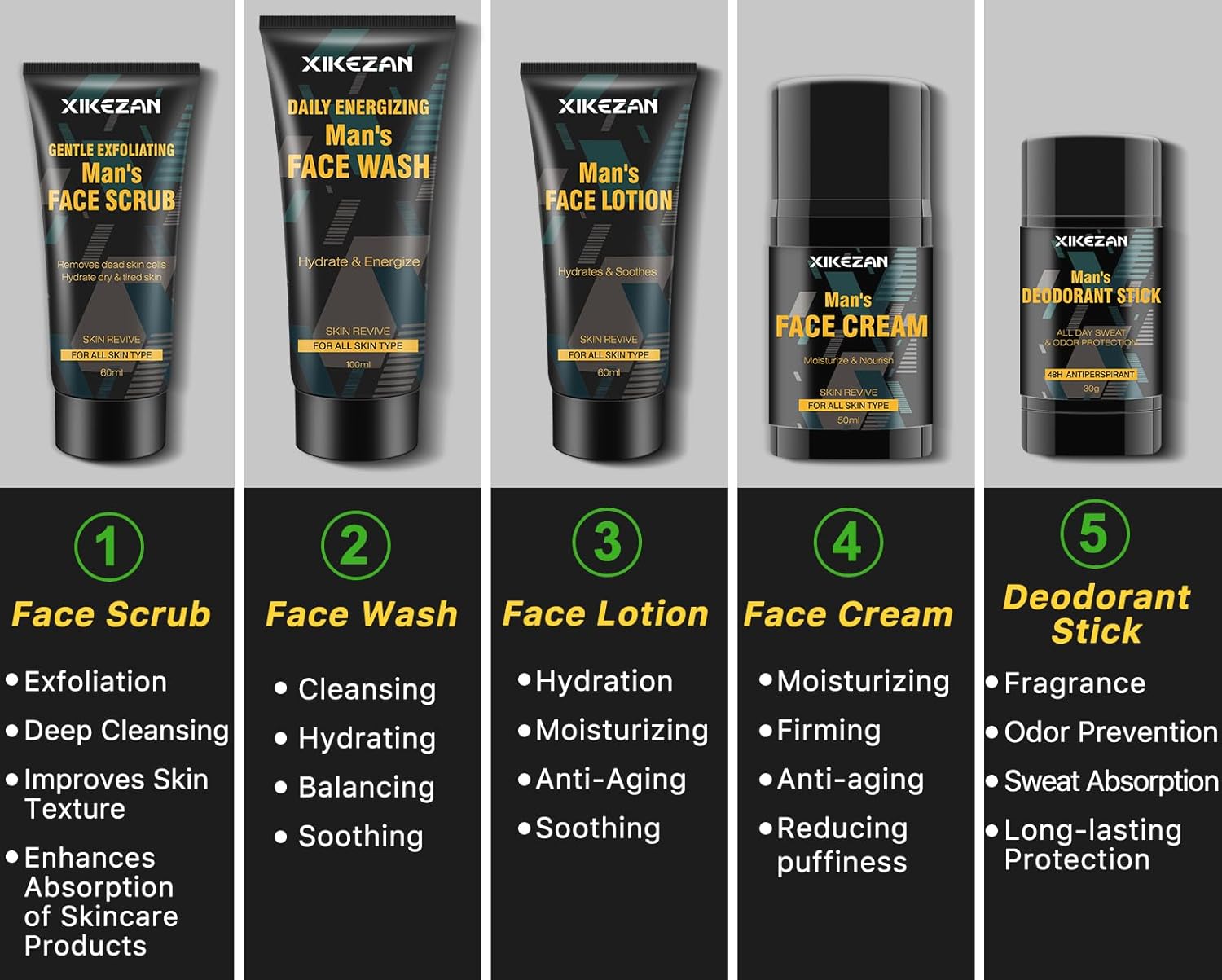 - Best Value Men's Skin Care Sets: The XIKEZAN mens skin care routine kit is designed to help refresh and maintain your skin's health.Our complete mens cologne gift set comes with our Mens Face Wash,Face Scrub,Face Cream,Face Lotion and Deodorant. Packaged in a stylish and luxury gift box,this men skin care kit is a perfect valentines day gifts,fathers day gifts,birthday day gifts,anniversary gifts,christmas gifts for dad father boyfriend husband brother teen boys,gifts for men who want nothing!
