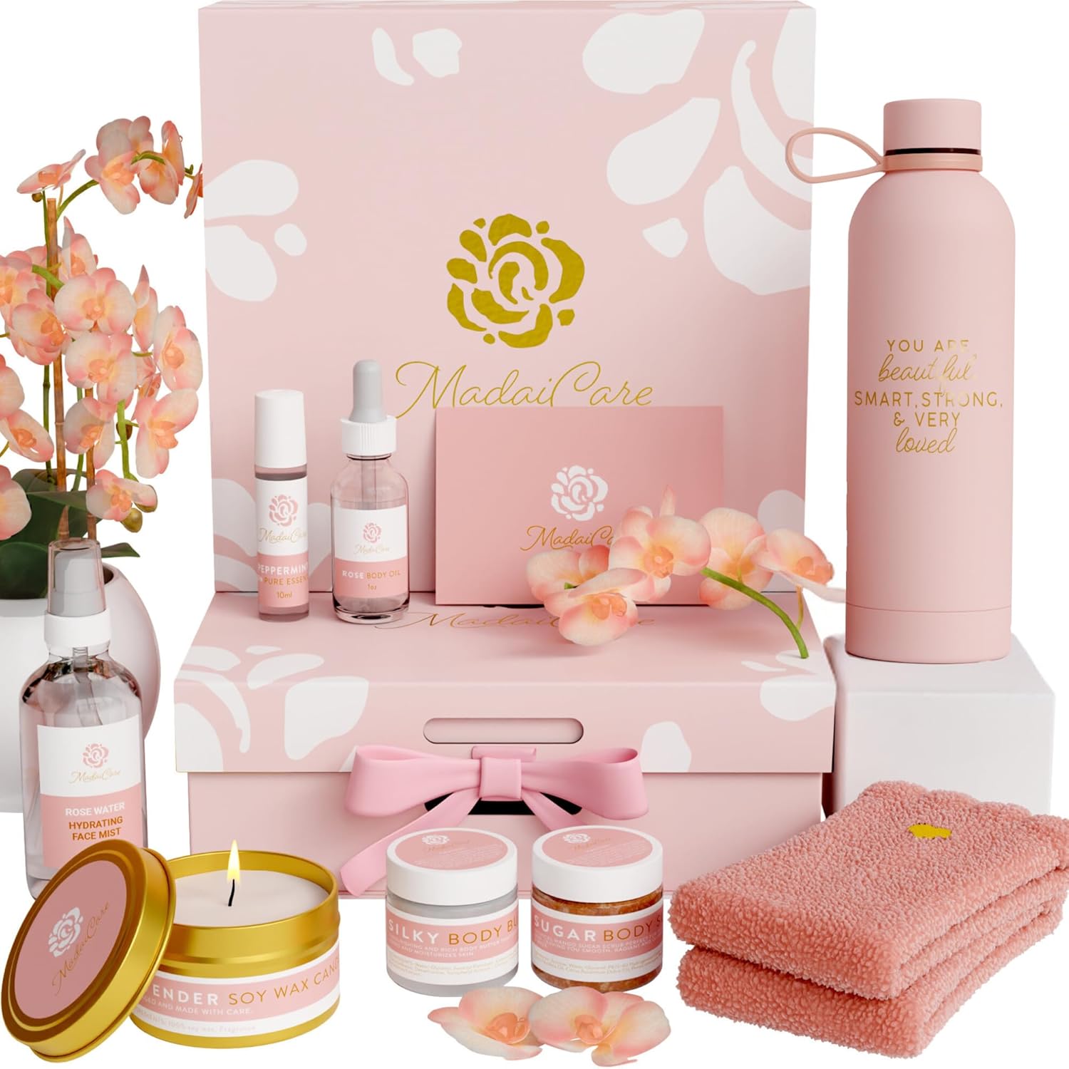 - THE ULTIMATE SPA GIFT SET: Pamper yourself or a loved one with Madai Careβs luxurious spa gift set for women. This premium set includes cozy socks, exfoliating body scrub, hydrating mango body butter cream, soothing vanilla and lavender-scented candles, refreshing facial mist, nourishing body oil, invigorating roll-on peppermint, and a stylish insulated water bottle.