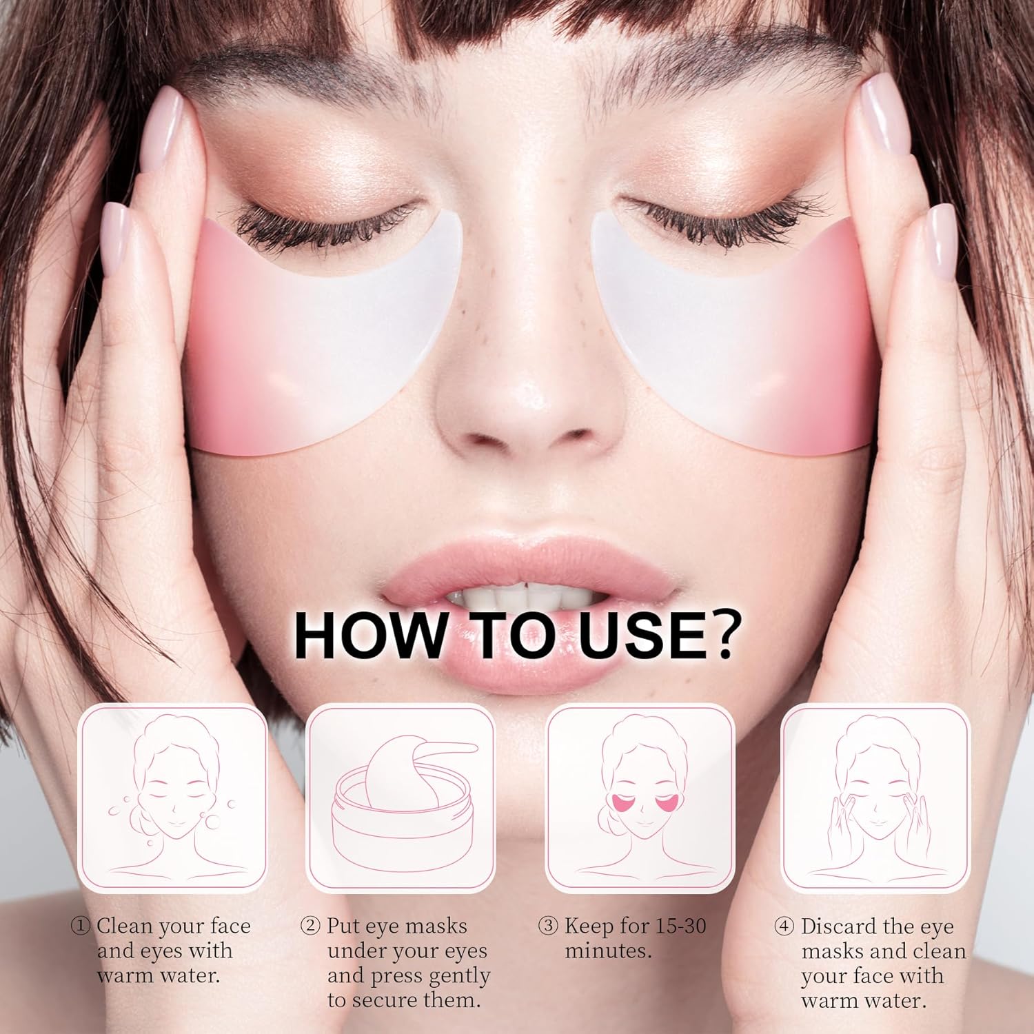 - [Usage Tips]-Wash your face with water before use, and don't apply eye cream or other skin care products on the part where the eye patch is used, otherwise, the eye patch is more likely to slip off during use. You can apply eye cream or other skin care products after use.