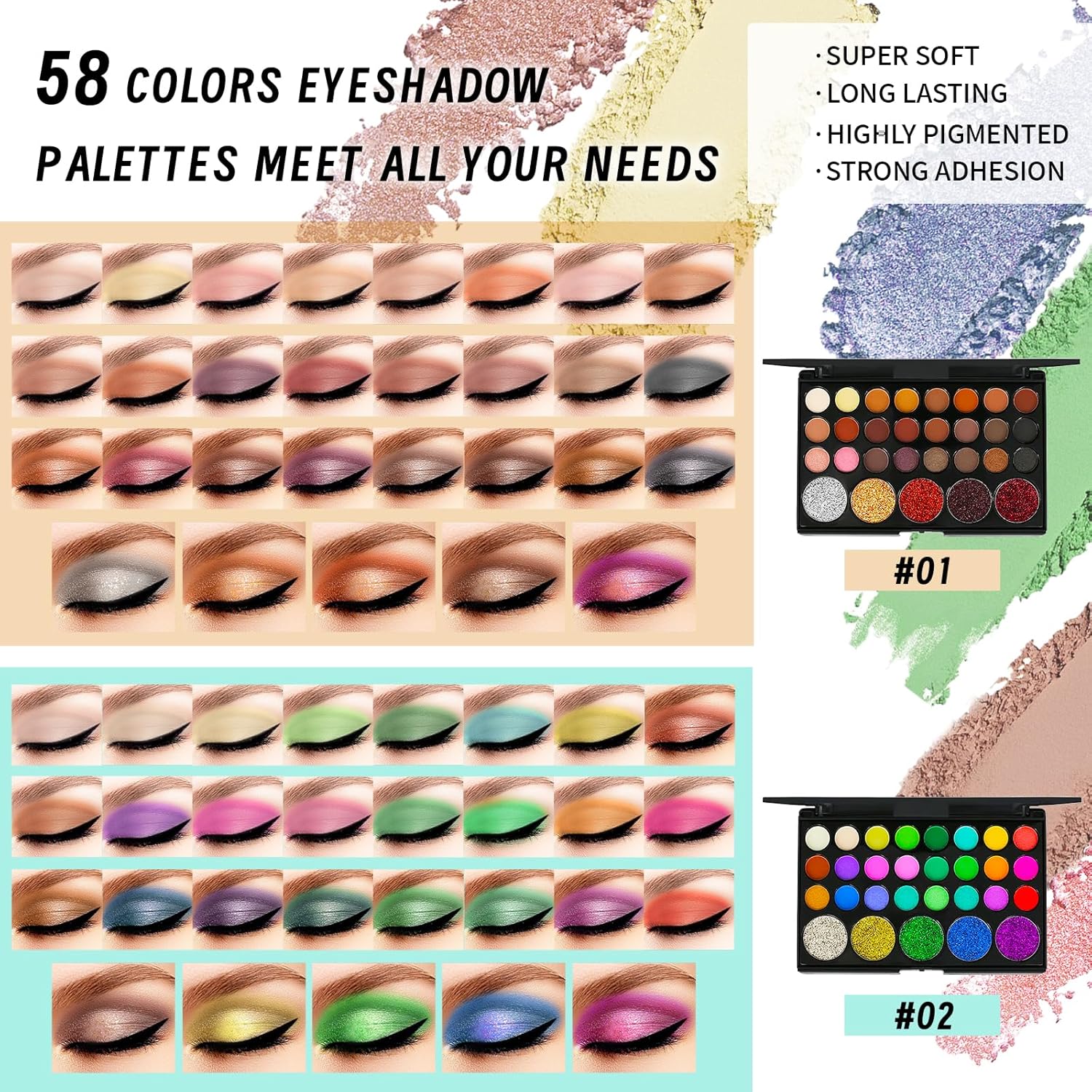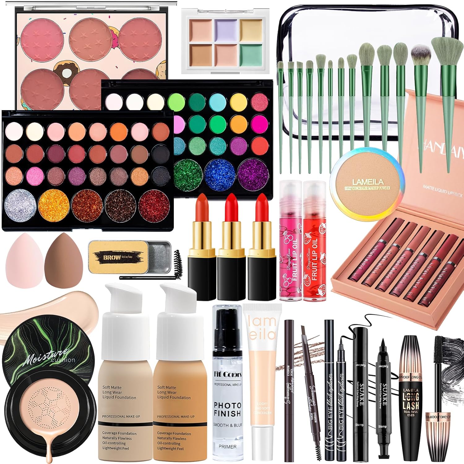 - [Makeup Set] The makeup present set for women includes natural mushroom head air cushion cc cream, full coverage natural & buff Beige foundation, face primer, 2 Γ 29 colors eyeshadow palette, liquid concealer, counter palette, blush palette, makeup setting powder, eyebrow soap, eyebrow pencil, eyeliner, winged eyeliner stamp, waterproof mascara, lipsticks, liquid lipsticks set, lip oil, makeup brush set, makeup sponges, cosmetic bag.