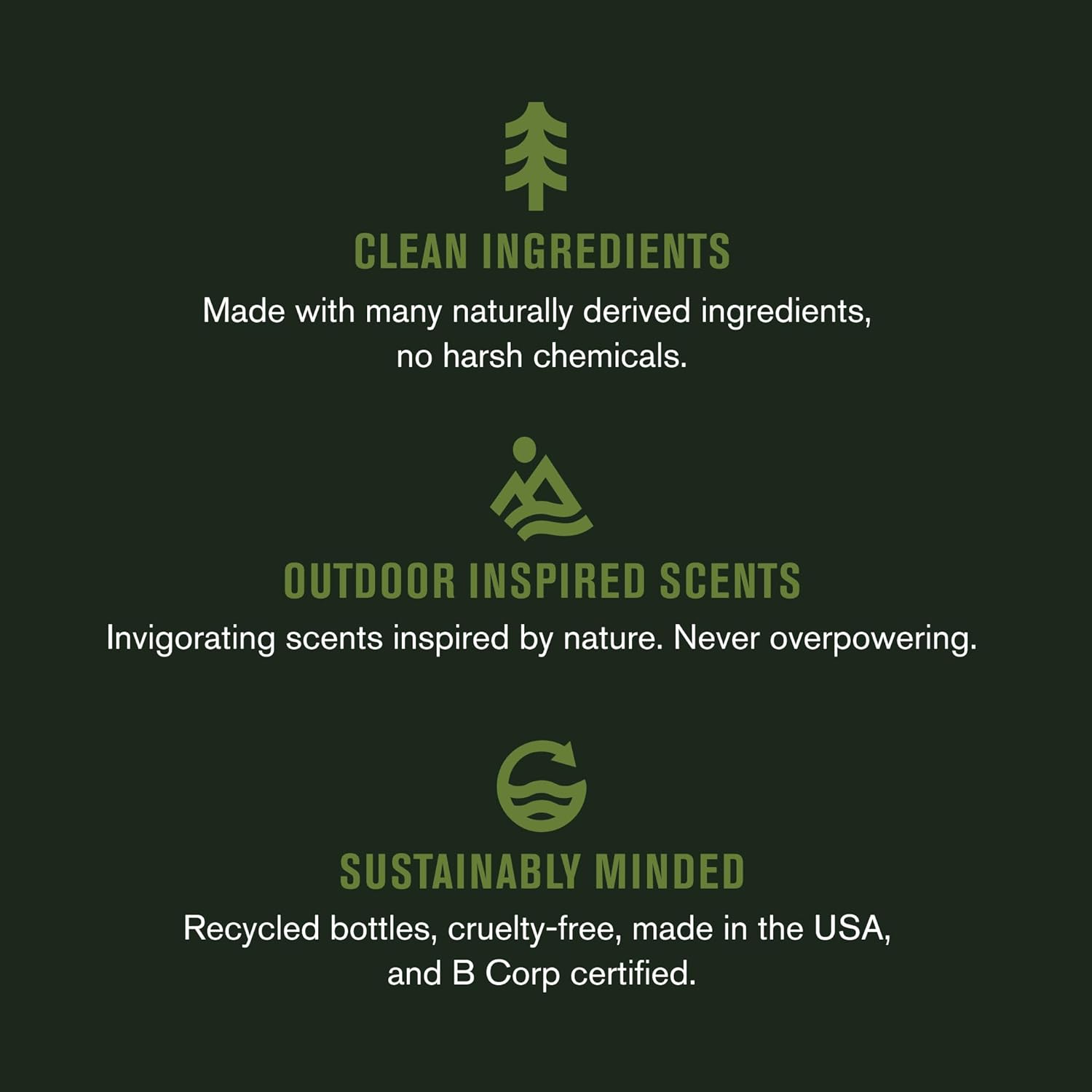 - OUTDOOR INSPIRED SCENTS: Sandalwood and Amber with a rich, complex finish; Pacific Cypresswith a complex, fresh finish; Coastal Moss with a peppery rugged finish.