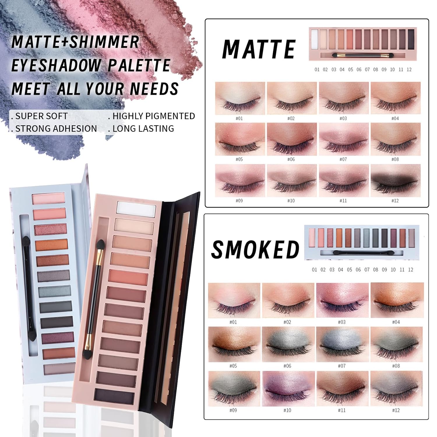 - [Full Face Makeup Set] The multipurpose makeup present set for women includes Full Coverage Nude & Buff Beige Foundation, Matte & Shimmer 12 Colors Eyeshadow Palette, 3pcs Liquid Lipsticks, Face Primer, Dual-Ended Counter Stick, Waterproof Cosmetic Bag, Eyebrow Soap set, Dual-ended Eyebrow Pencil, Winged Eyeliner Stamp, Waterproof Mascara, Makeup Brush & 2PCs Makeup Sponges. It can meet all the beginnersβ or professional makeup artistsβ needs for daily makeup.