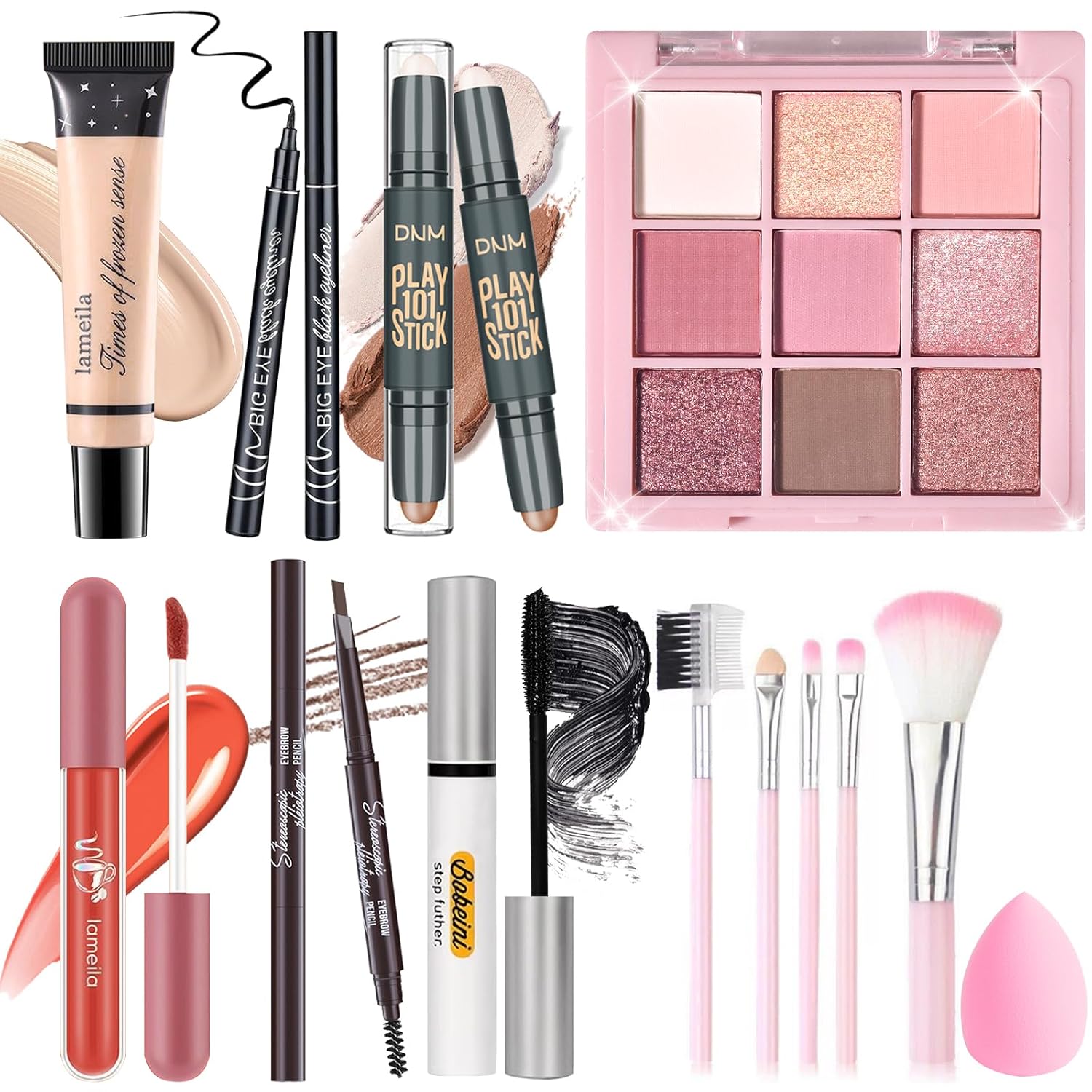 - [ Makeup Set] The ideal starter makeup kit includes 9 colors eyeshadow palette, dual-ended counter and highlighter stick, full coverage liquid foundation, dual-ended eyebrow pencil, eyeliner, waterproof mascara, lip gloss, 5 PCs makeup brushes set, makeup sponge. All womenβs makeup essentials are included.