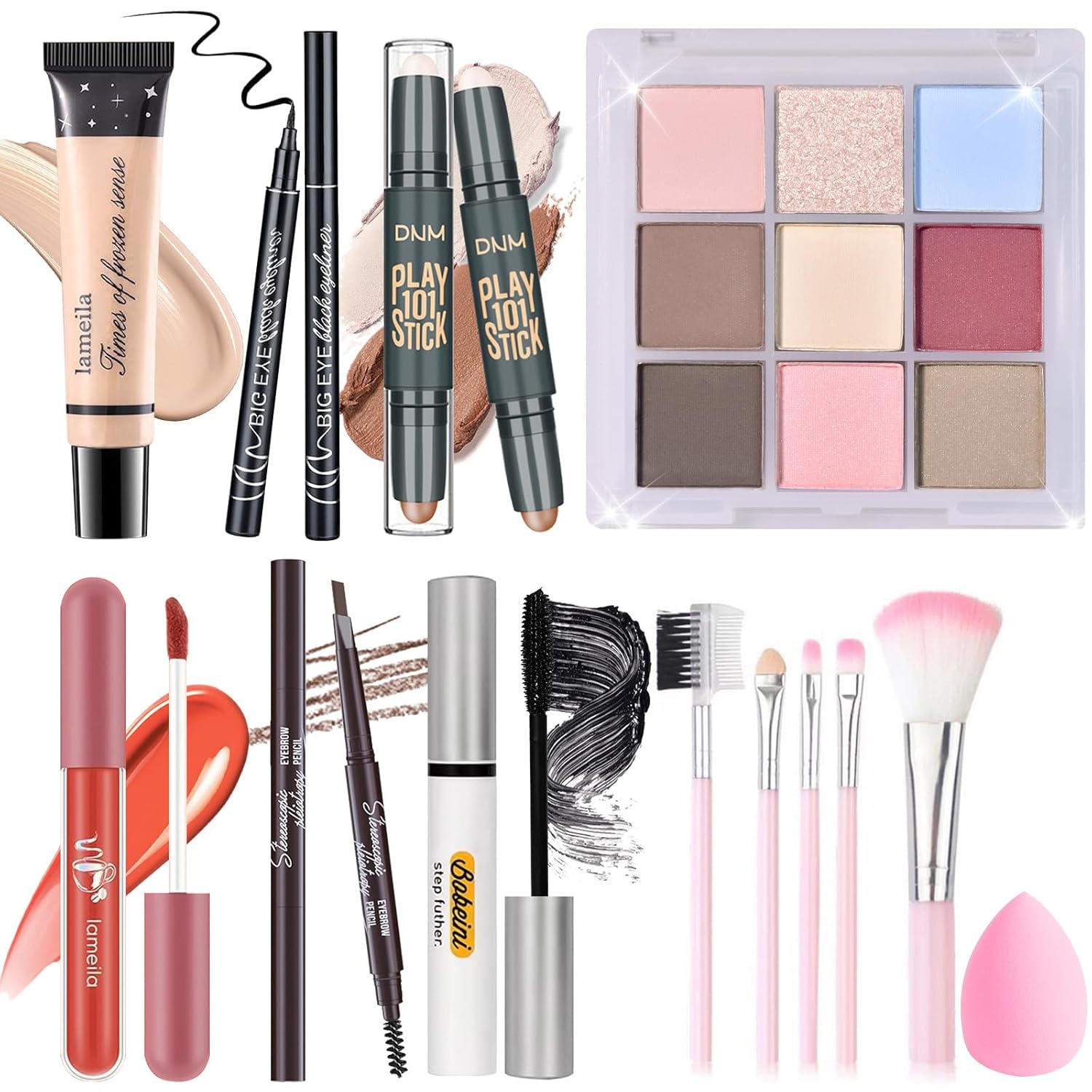 - [Makeup Set] The ideal starter makeup kit includes 9 colors eyeshadow palette, dual-ended counter and highlighter stick, full coverage liquid foundation, dual-ended eyebrow pencil, eyeliner, waterproof mascara, lip gloss, 5 PCs makeup brushes set, makeup sponge. All womenβs makeup essentials are included.