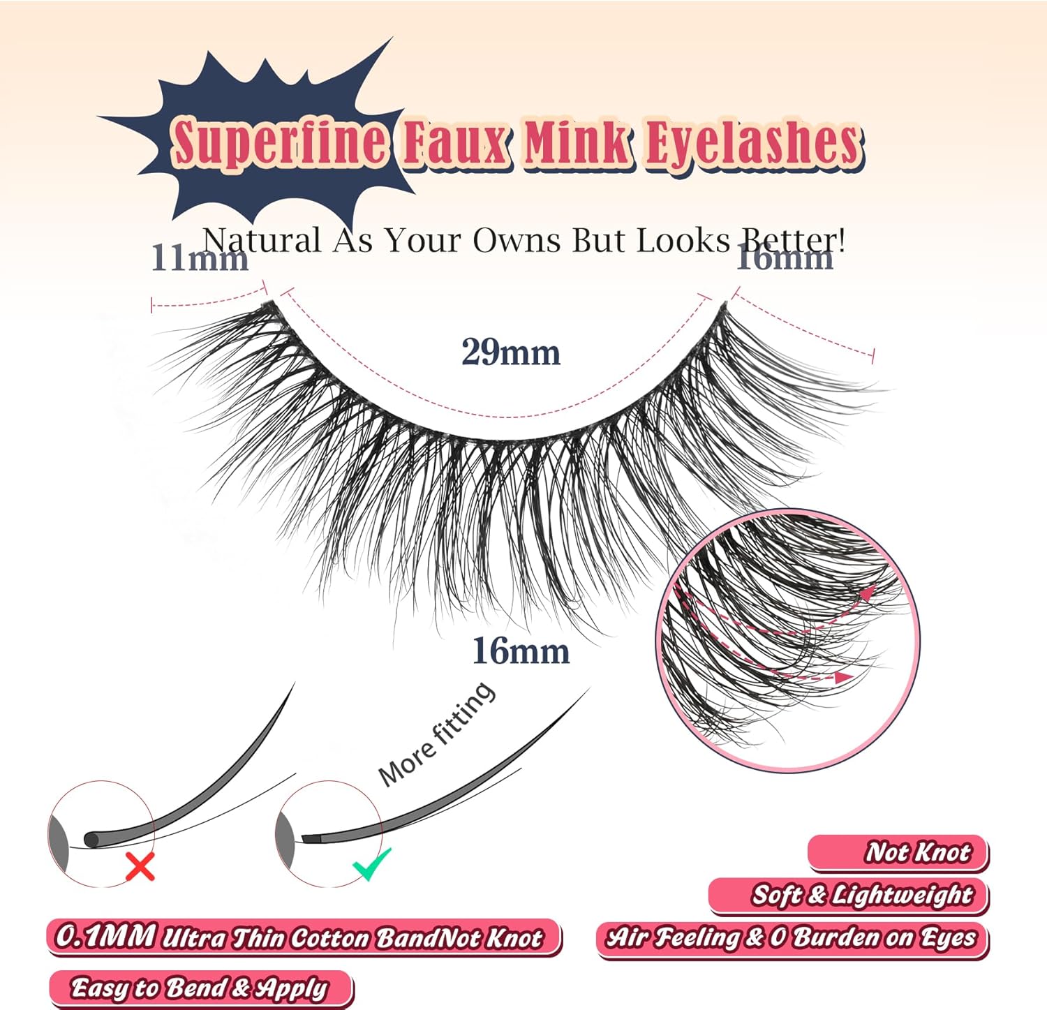- THIN FLAT BAND STRIP LASHES: The wispy eyelashes use 0.1mm thin flat cotton black band, seamlessly blend to your real eye lashes for a natural make up look. Apply in a minute, perfectly suit for DAY-TO-DAY use, vacation party or date and all of age