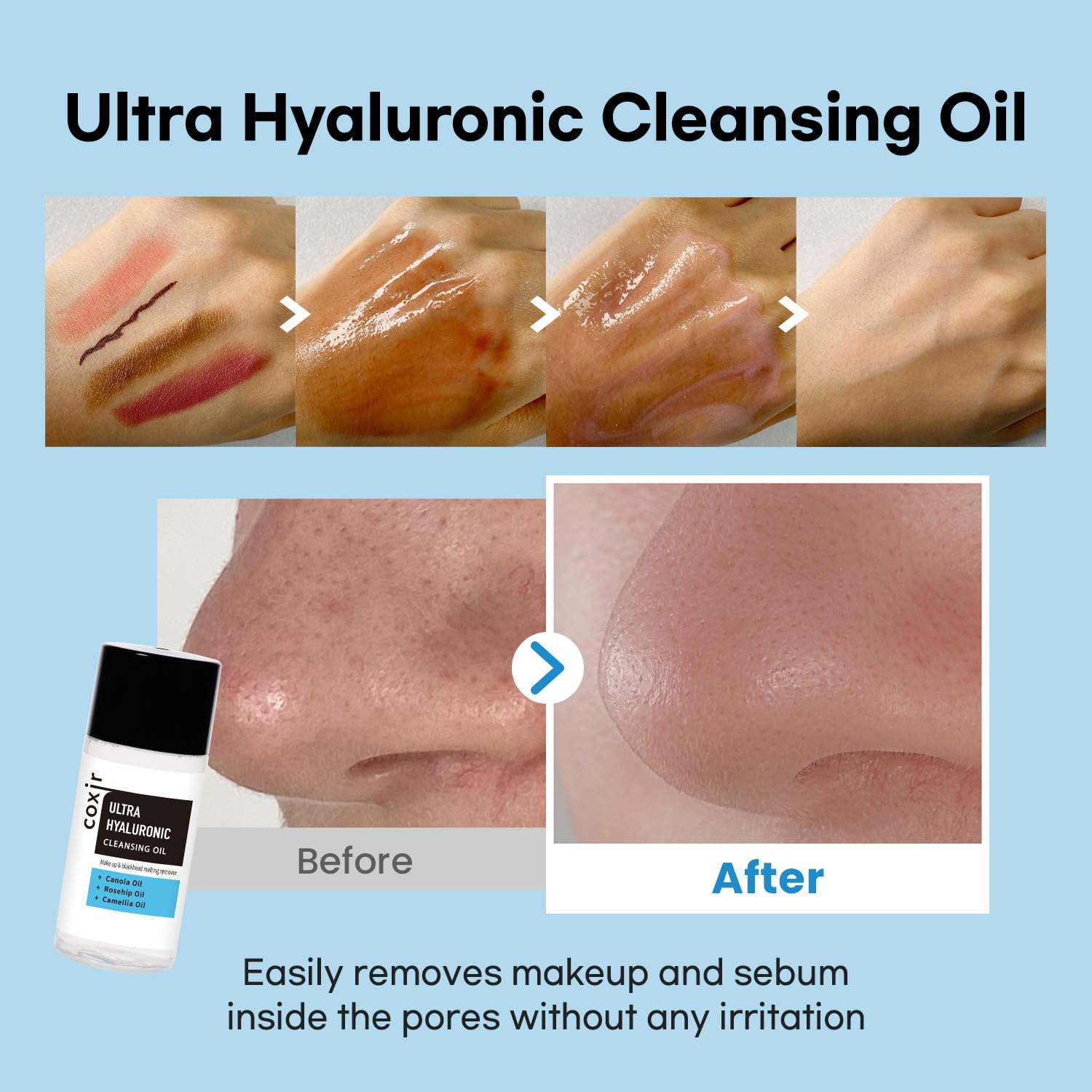 - [CLEANSING OIL] Hyaluronic cleansing oil cleverly clings to impurities, blackhead, whitehead and sebum inside the pores without any irritation. Easily removes daily makeup(sunscreen, foundation, eye makeup). It perfectly cleanses make-up without greasy residue and does not need 2nd cleansing