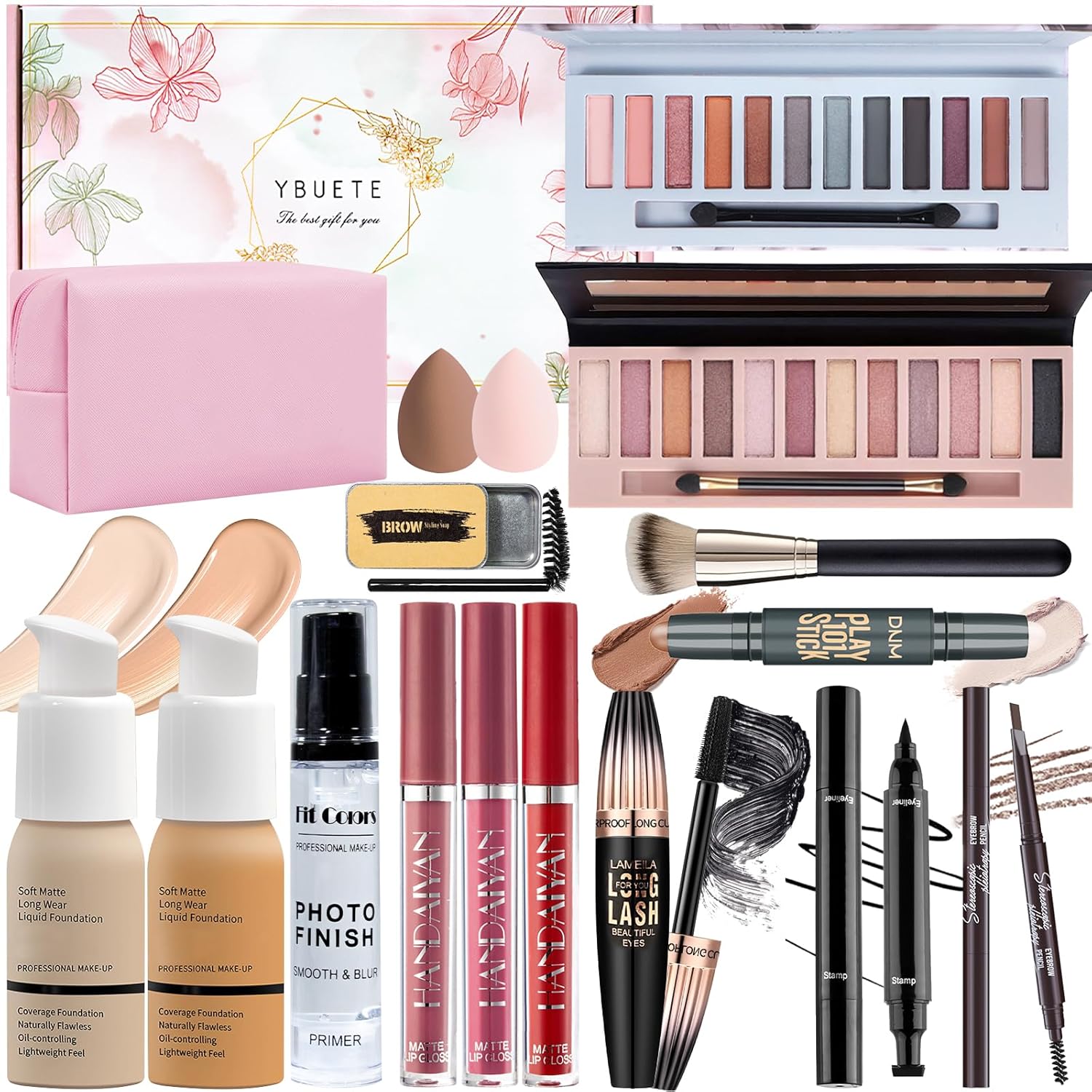- [Full Face Makeup Set] The multipurpose makeup gift set for women includes Full Coverage Nude & Buff Beige Foundation, Matte & Shimmer 12 Colors Eyeshadow Palette, 3pcs Liquid Lipsticks, Face Primer, Dual-Ended Counter Stick, Waterproof Cosmetic Bag, Eyebrow Soap set, Dual-ended Eyebrow Pencil, Winged Eyeliner Stamp, Waterproof Mascara, Makeup Brush & 2PCs Makeup Sponges. It can meet all the beginnersβ or professional makeup artistsβ needs for daily makeup.
