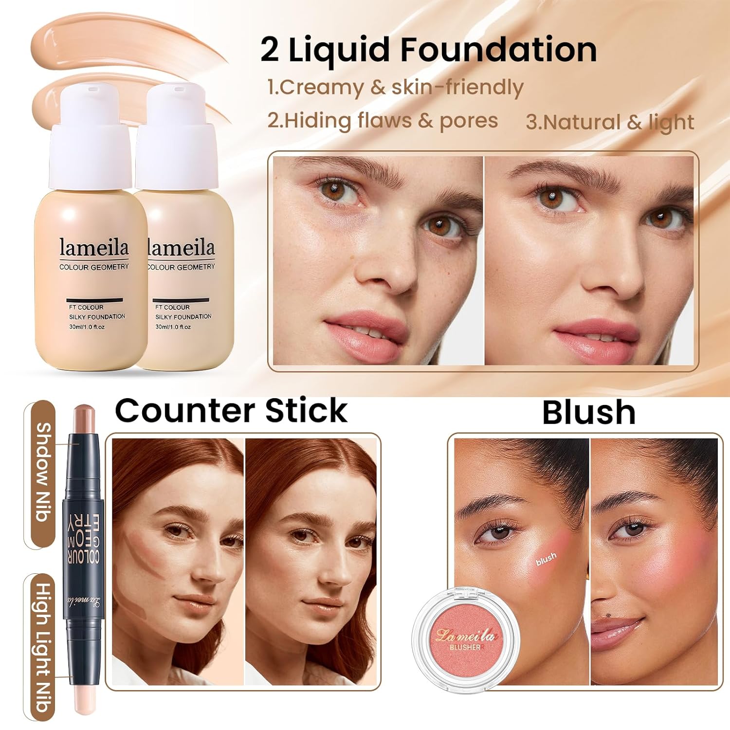 - γMakeup Kit for Women Full KitγThis makeup kit for women includes 2 14-Color matte & shimmer eyeshadow palette, 2 liquid foundation, 1 counter stick, 1 blush, 3 lip gloss, 1 waterproof mascara, 1 eyebrow pencil, 1 eyeliner stamp, 8 makeup brushes, 2 makeup sponges and 1 cosmetic bag.This comprehensive set covers the majority of your daily facial makeup essentials.