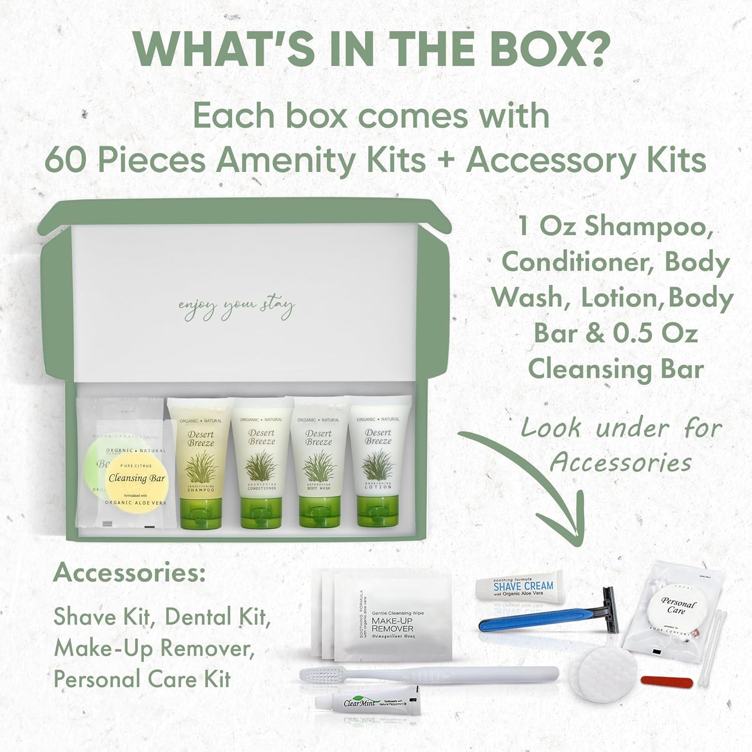 Desert Breeze Amenity & Accessory Kit | 1 oz Travel Size Shampoo, Conditioner, Lotion, Body Wash, Body Bar, Cleansing Bar, Shave & Dental Sets, Make-Up Remover Wipes, & Vanity Kit | 60 sets per case