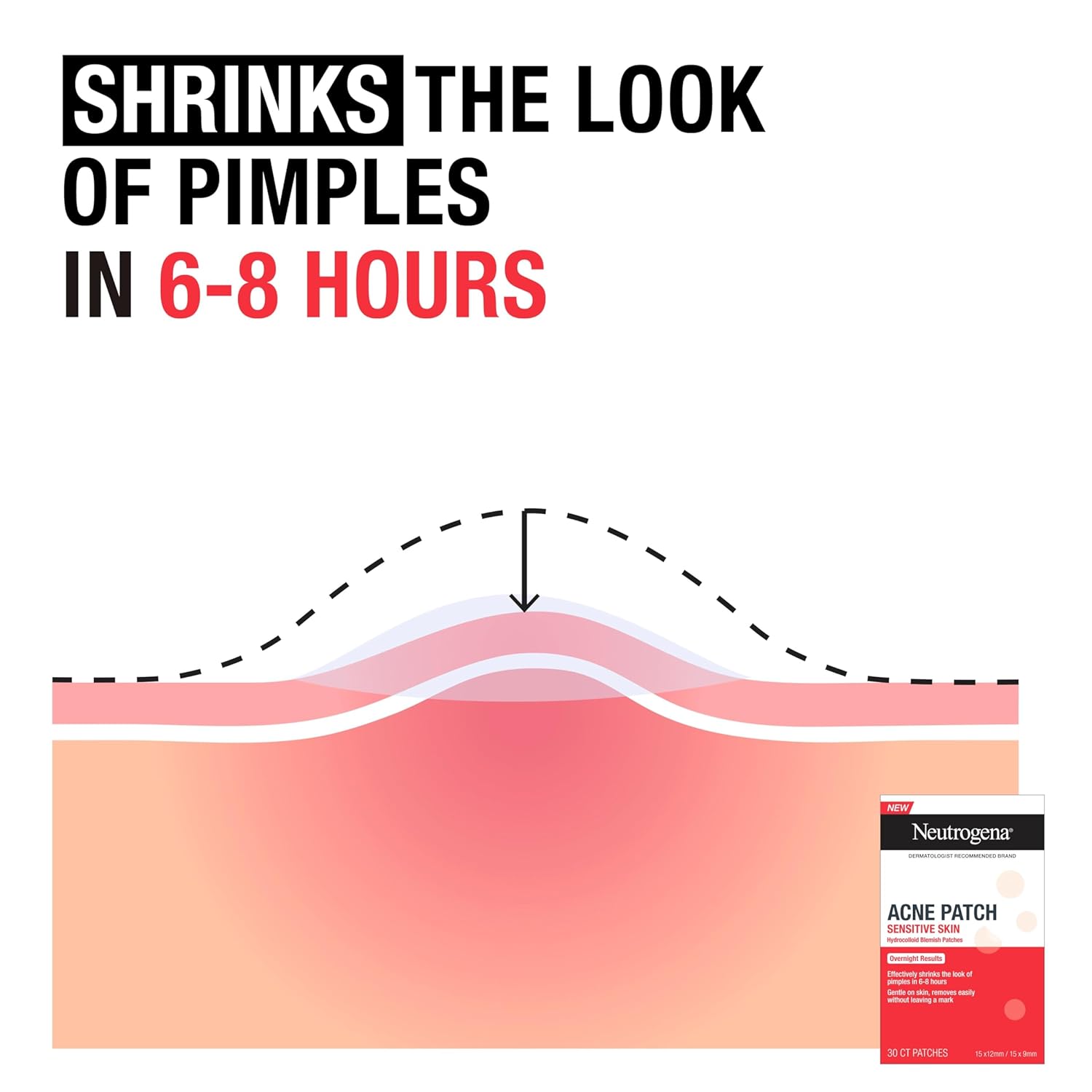 - 30-count variety pack of Neutrogena Hydrocolloid Acne Patches for Sensitive Skin, including 12, 9mm patches & 18, 12mm patches, to shrink the look of pimples