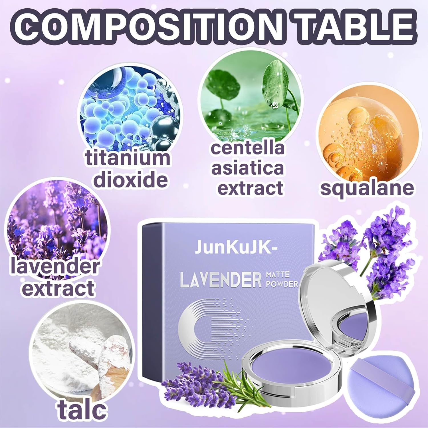 - ๐ฝใLong-lasting Oil ControlใLavender matte powder gives you a long-lasting hold while drawing oil away from your face, giving you a matte, fresh matte finish.