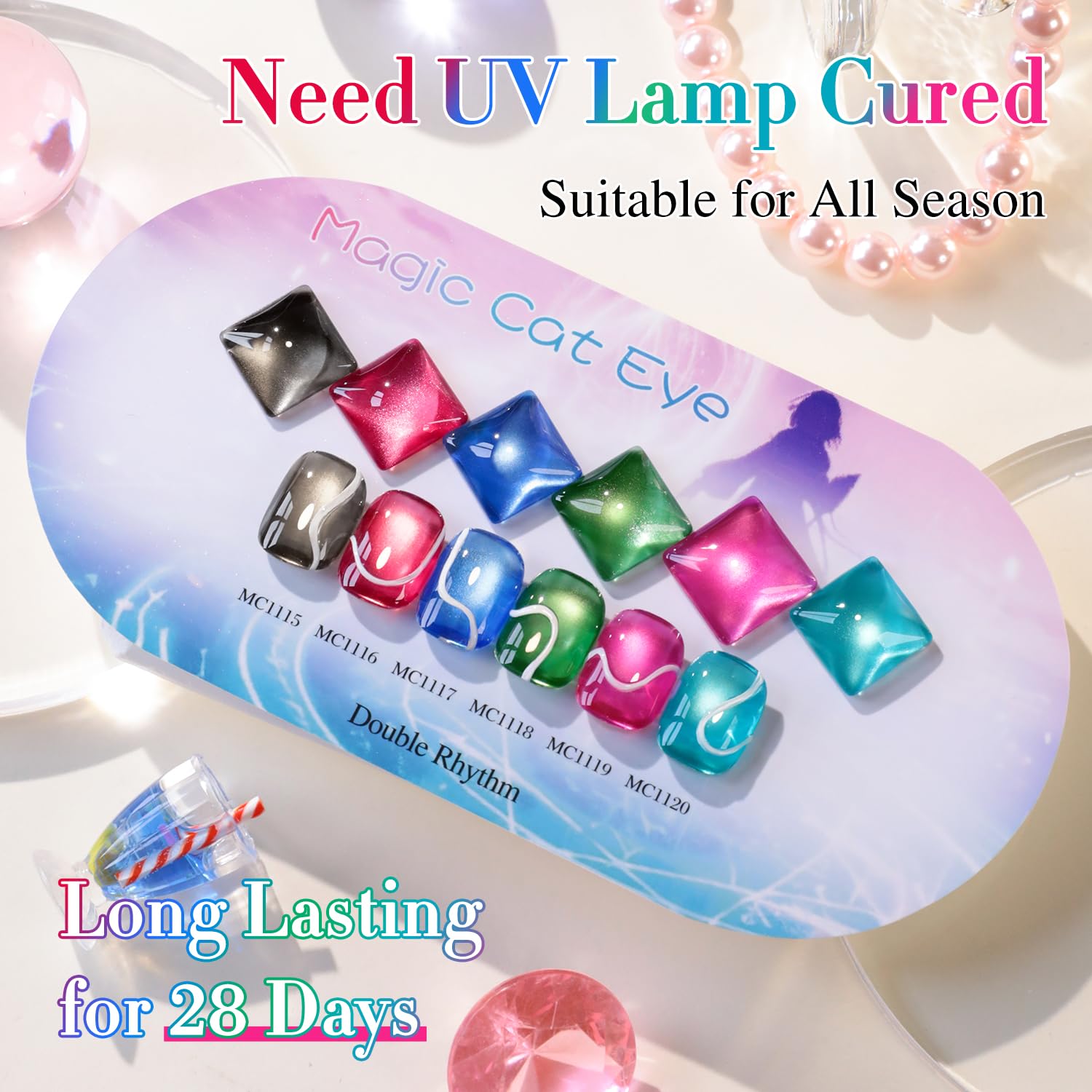 - 6 Colors Cat Eye Gel Polish Set: Double Rhythm cat eye gel nail polish kit includes 6colors 7.5ml / 0.25 fl.oz gel nail polish. This cat eye gel nail polish set includes black red green blue colors.Each kit comes with one magnetic tool for you to create a different cat eye style for your nails.