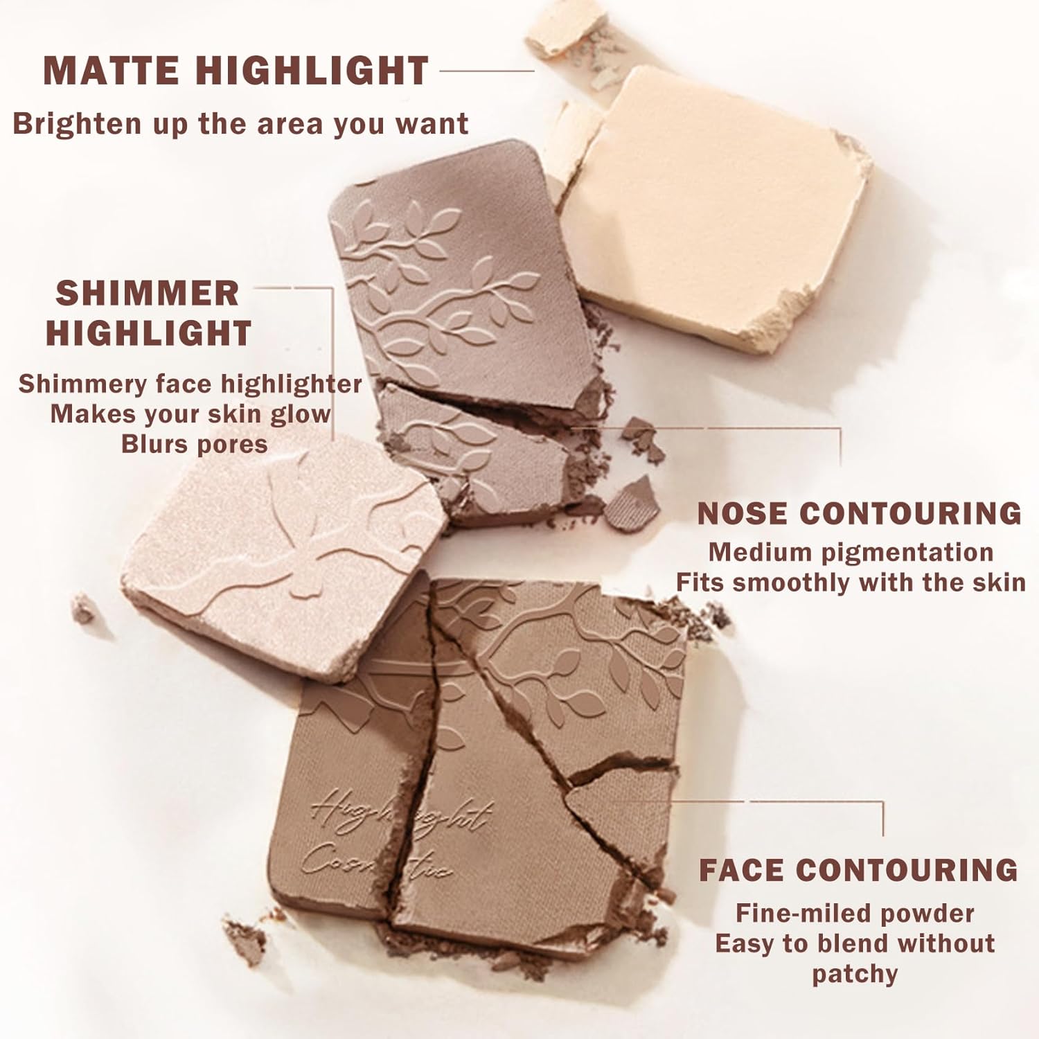 - 【2 In 1 Highlighter Contour Palette】Highlighter contour palette combines matte and shimmer highlights, as well as 2 matte contour tones, the highlight is used to brighten and the contour is used to shape, it can be mixed to achieve a richer effect and create a three-dimensional and bright makeup.