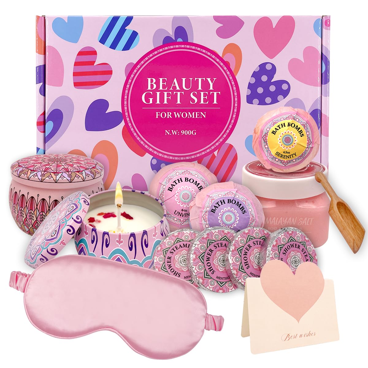 - Complete Spa Experience at Home: Indulge in a luxurious spa experience with our carefully curated beauty gift set, designed to pamper and rejuvenate. This comprehensive set includes 4 aromatic shower steamers, 3 fizzing bath bombs, 2 scented candles, and 1 exfoliating body scrub, 1 wooden scoop, 1 sleep mask, and 1 gifting card. creating the perfect ambiance for relaxation and self-care.