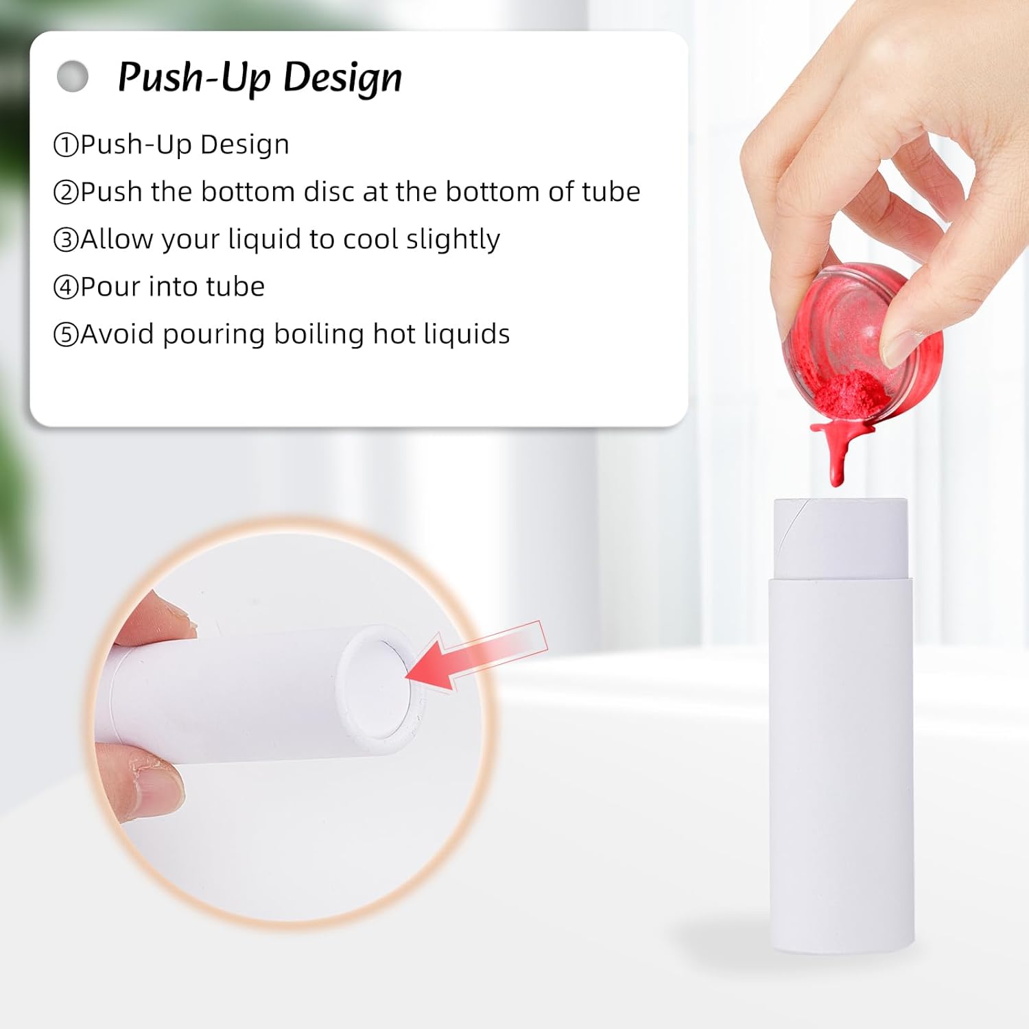- EASY TO USE: With a unique push-up design, our tubes eliminate the need for traditional twisting bottoms. Simply push the bottom disc upward with your finger to dispense the contents, offering effortless convenience with no worries about leaks.