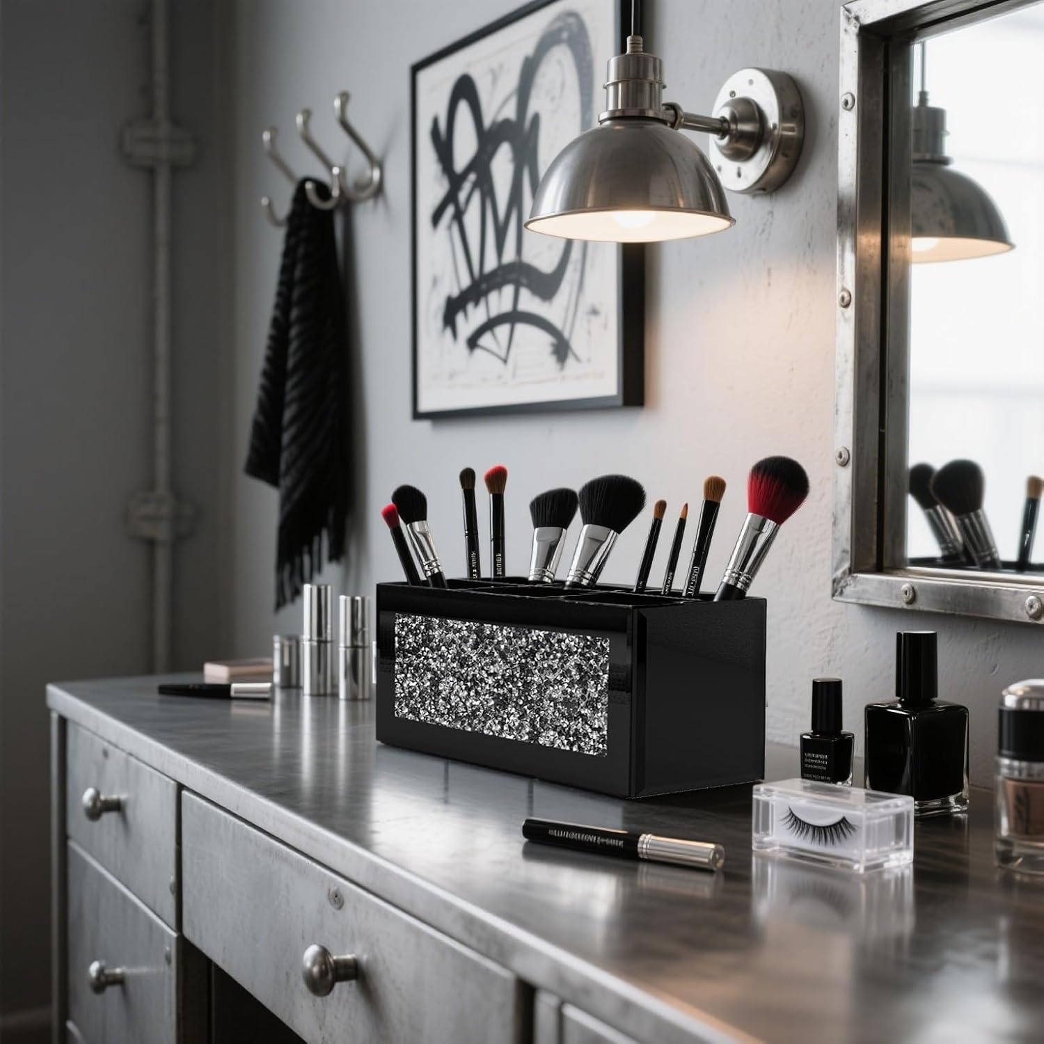 - Sleek Black Design with Crystal Detailing: The SHYFOY Makeup Brush Holder in a elegant black glass finish is perfect for adding a touch of glam to your bathroom. The 6-slot design, combined with front-facing crystal embellishments, offers an elegant solution for organizing your beauty essentials.