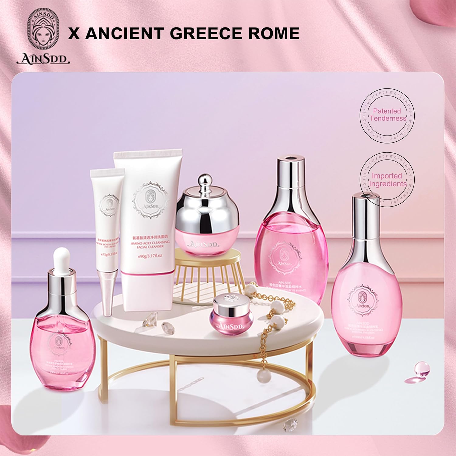 - π There are seven parts in this set, including cleanser, toner, lotion, cream, serum and so on. Each one has its own unique efficacy and can be targeted to help you solve multiple facial skin problems at the same time. Whether it is lack of water, sensitivity, dullness or enlarged pores and other problems, it can be effectively improved.