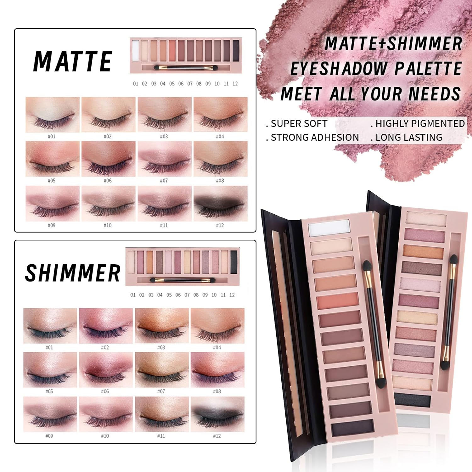 - [Makeup Set] The Christmas makeup gift set for women includes Matte & Shimmer 12 Colors Eyeshadow Palette, Full Coverage Nude & Buff Beige Foundation, 3pcs Liquid Lipsticks, Face Primer, Highlighter & Contour & Blusher 3 in 1 Makeup Palette, Waterproof Cosmetic Bag, Eyebrow Soap set, Dual-ended Eyebrow Pencil, Winged Eyeliner Stamp, Waterproof Mascara, Makeup Brush & 2pcs Makeup Sponges. It can meet all the beginnersβ or professional makeup artistsβ needs for daily makeup.