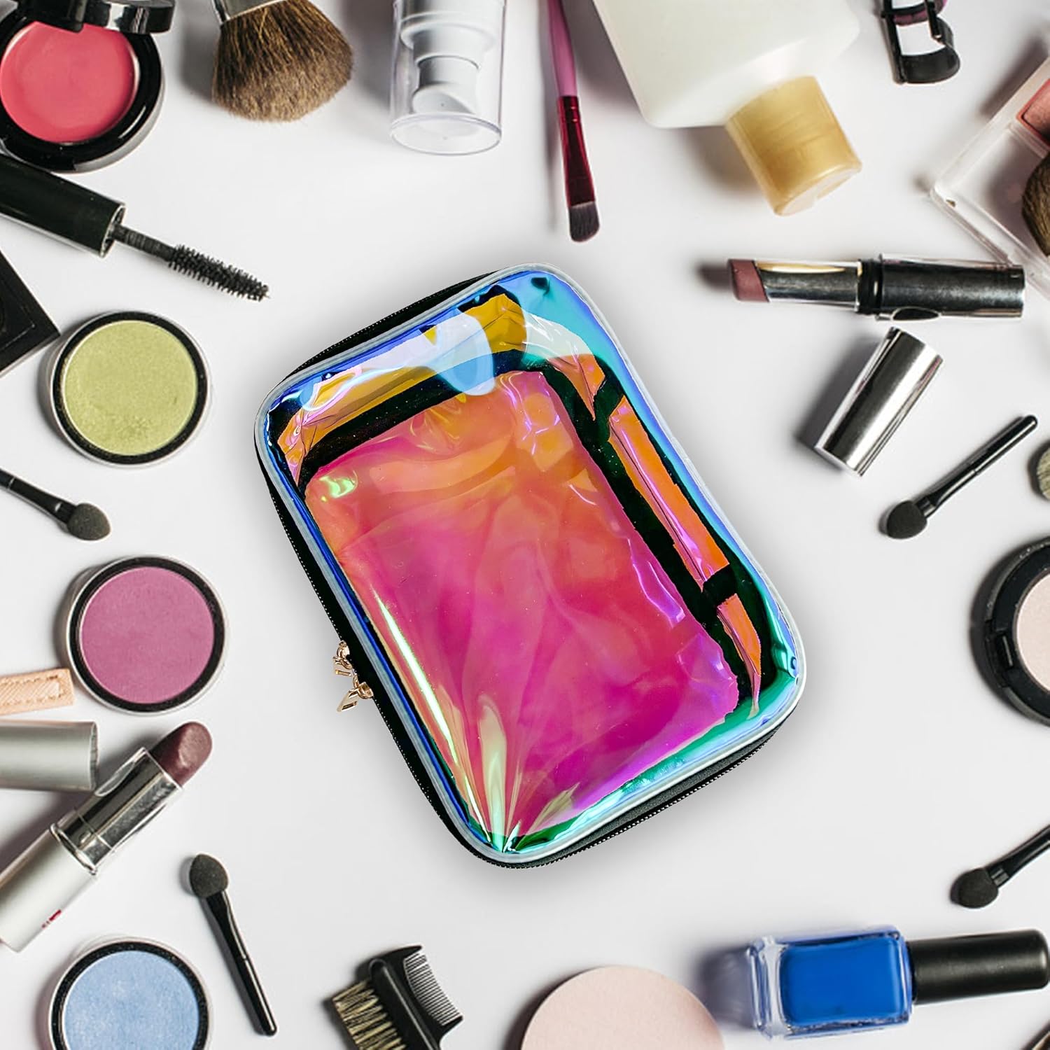 - ๐ทใWide Range of UsesใOur transparent holographic cosmetic bag can not only be used as a storage bag,waterproof bag,gift bag,frequently used item bag,but also can be used to store cash,glasses,keys,portable batteries,etc.This waterproof and dustproof tote makeup bag keeps everything safe and prevents liquid leaks